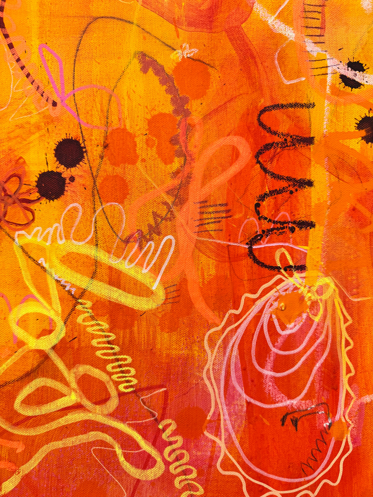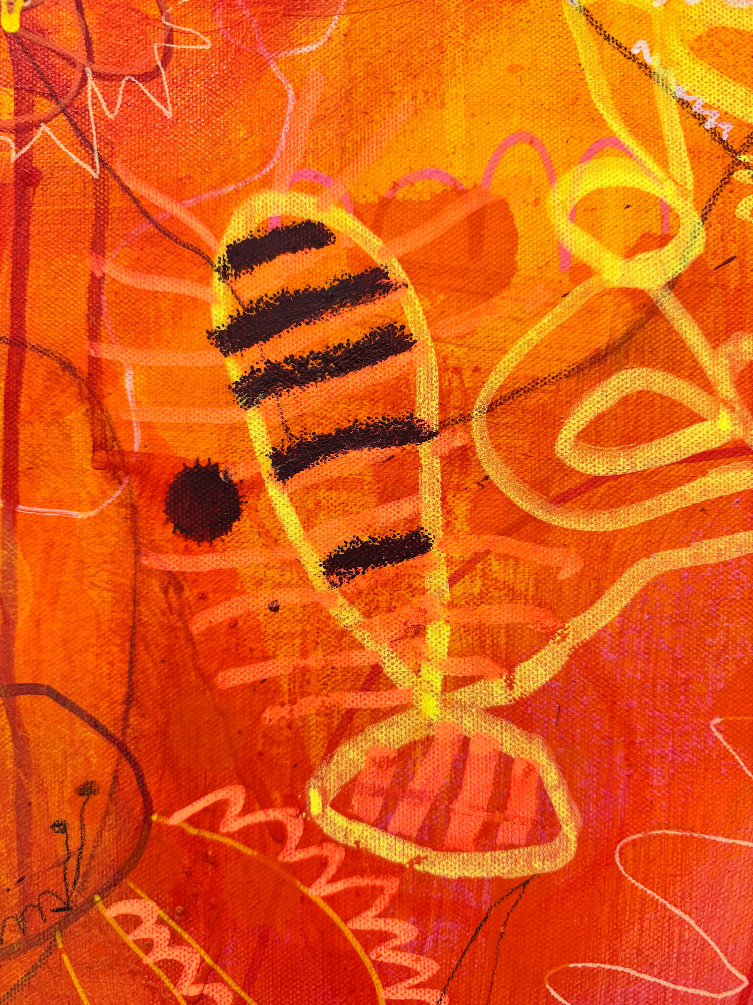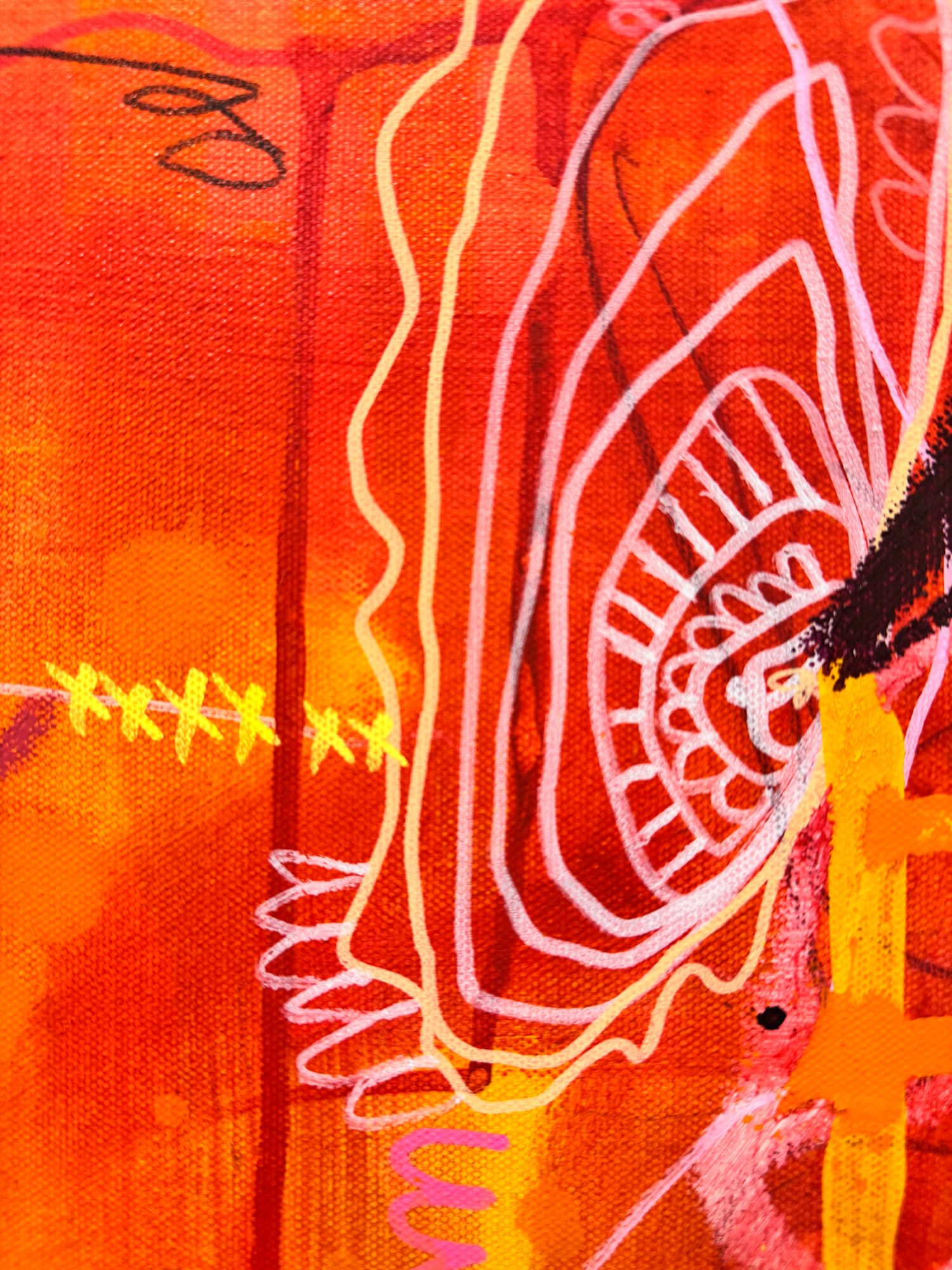 Mixed media on canvas — acrylic, paint markers, graphite, colored pencils, and oil pastels