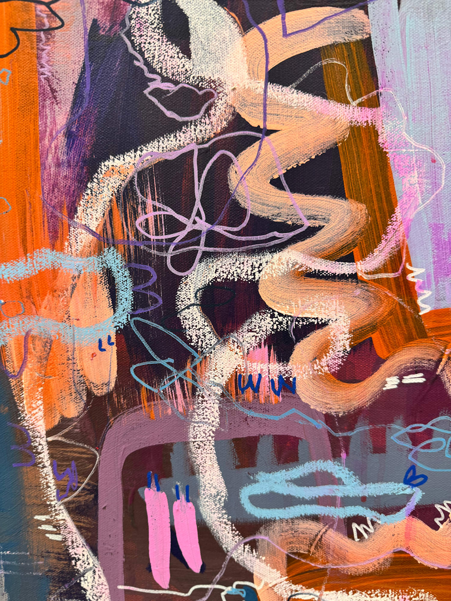 The Road Less Travelled is about those split-second choices—the ones that reroute your whole damn life. The left turn you didn’t take. The trip you almost skipped. The moment you said yes when you didn’t have a plan yet. This piece holds the chaos of alternate timelines, tangled what-ifs, and the beauty of not knowing what’s next. Layered with acrylic paint, oil pastels, paint markers, graphite, and ink, it plays with movement, tension, and color like a map that leads nowhere and everywhere all at once. A visual breadcrumb trail of decisions made—and the wild, twisted magic that unfolds when you follow the unknown.