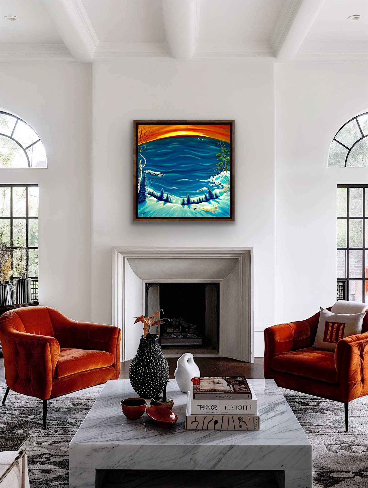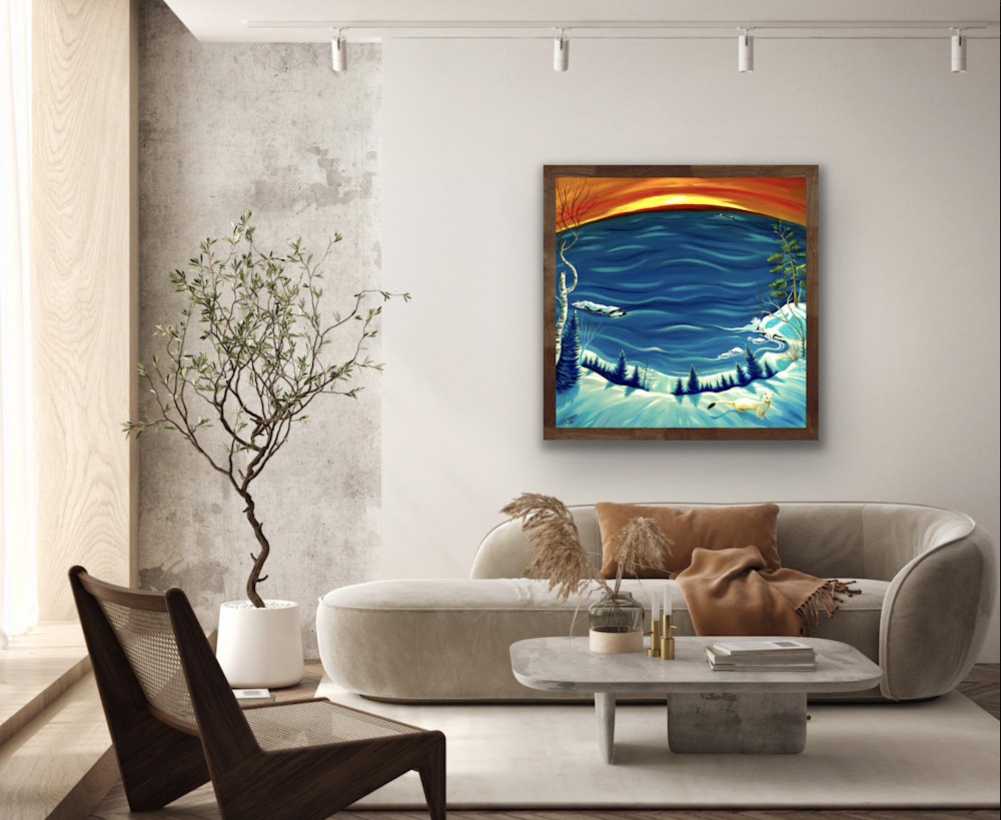 A striking depiction of a wintry landscape, dominated by a vast, undulating body of water. The deep blues of the water blend seamlessly with the snowy foreground, creating a vivid contrast that draws the viewer's eye. The sky above transitions from a rich, warm orange at the horizon to a cooler gradient, suggesting either sunrise or sunset. Bare trees on the left and right frame the scene, adding to its natural tranquility, while evergreen trees peppered with snow add depth and texture to the composition.