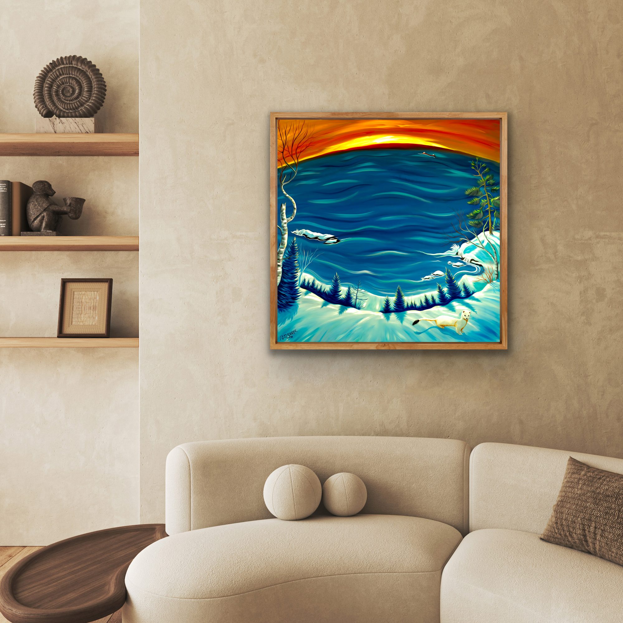 The inclusion of a small, curious animal, potentially an ermine, in the snow at the bottom right adds a touch of liveliness and connects the viewer to the scene on a more intimate level. Further adding interest is a canoe or small boat barely visible against the water, hinting at human presence and adventure. The brushstrokes are fluid and dynamic, especially in the water, conveying a sense of movement and life.