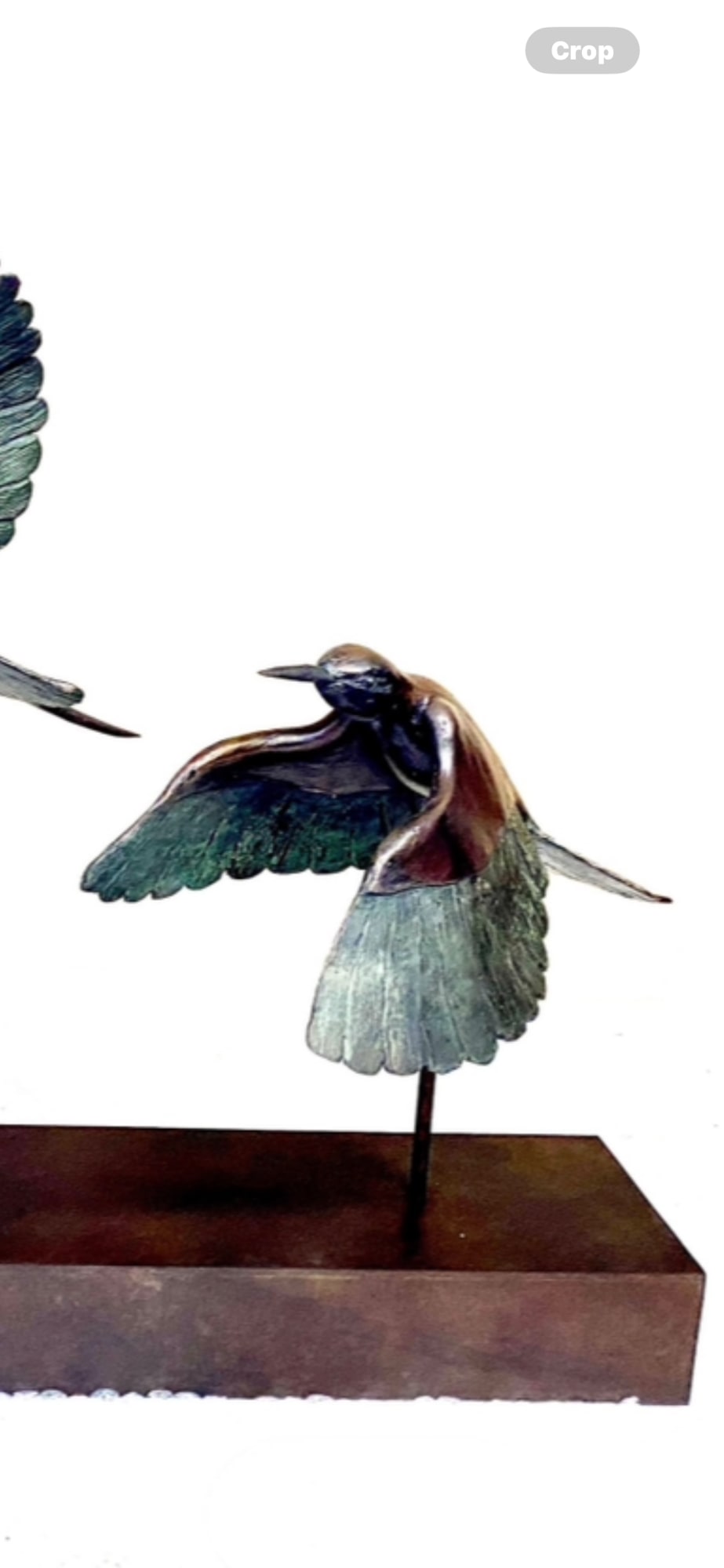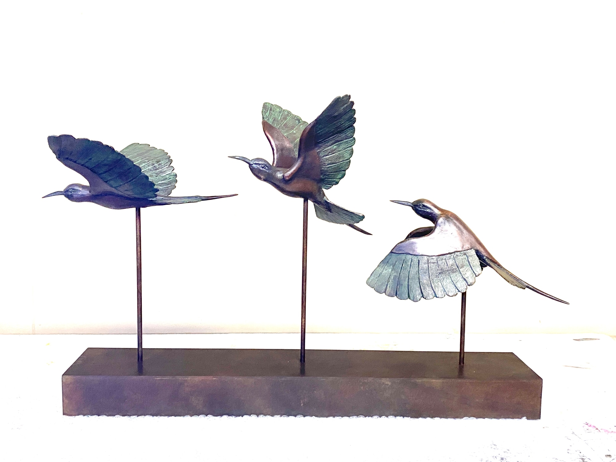 Three life-size bronze Bee-Eaters in Flight, mounted on a stainless steel base.