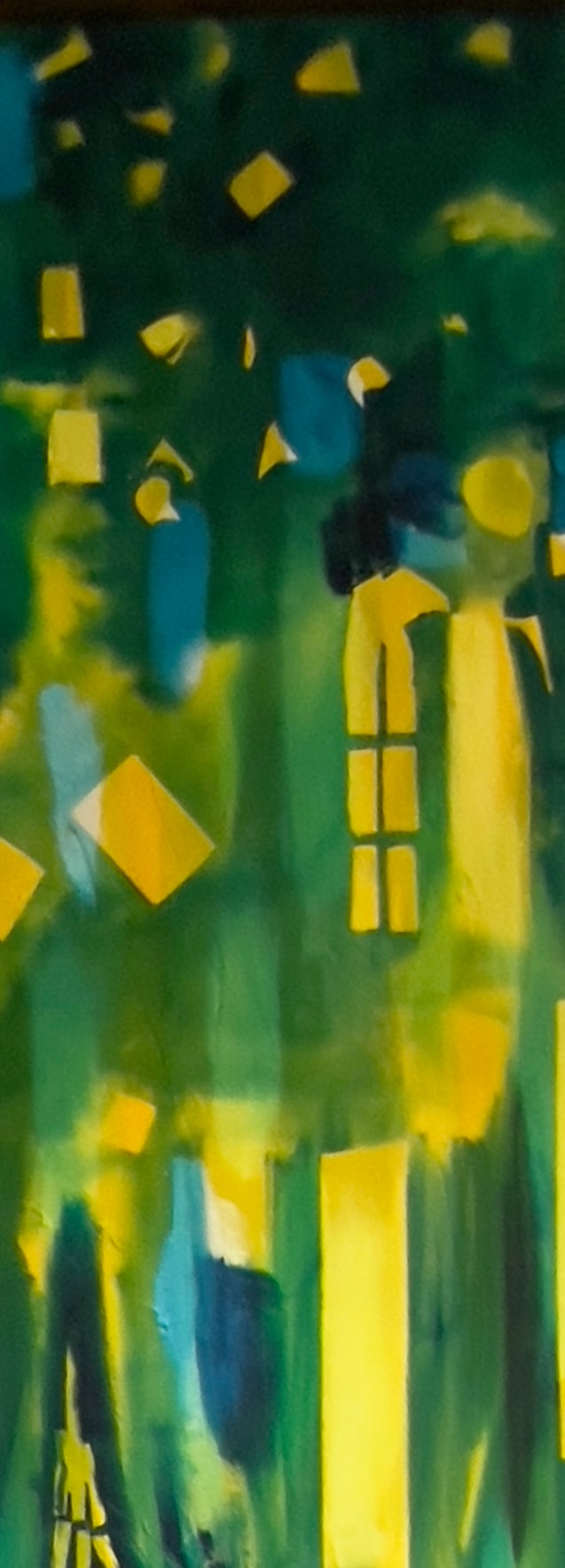 Abstract expressionist painting of a city at night, inspired by Milwaukee, lights glowing through multitudes of windows in the darkness.