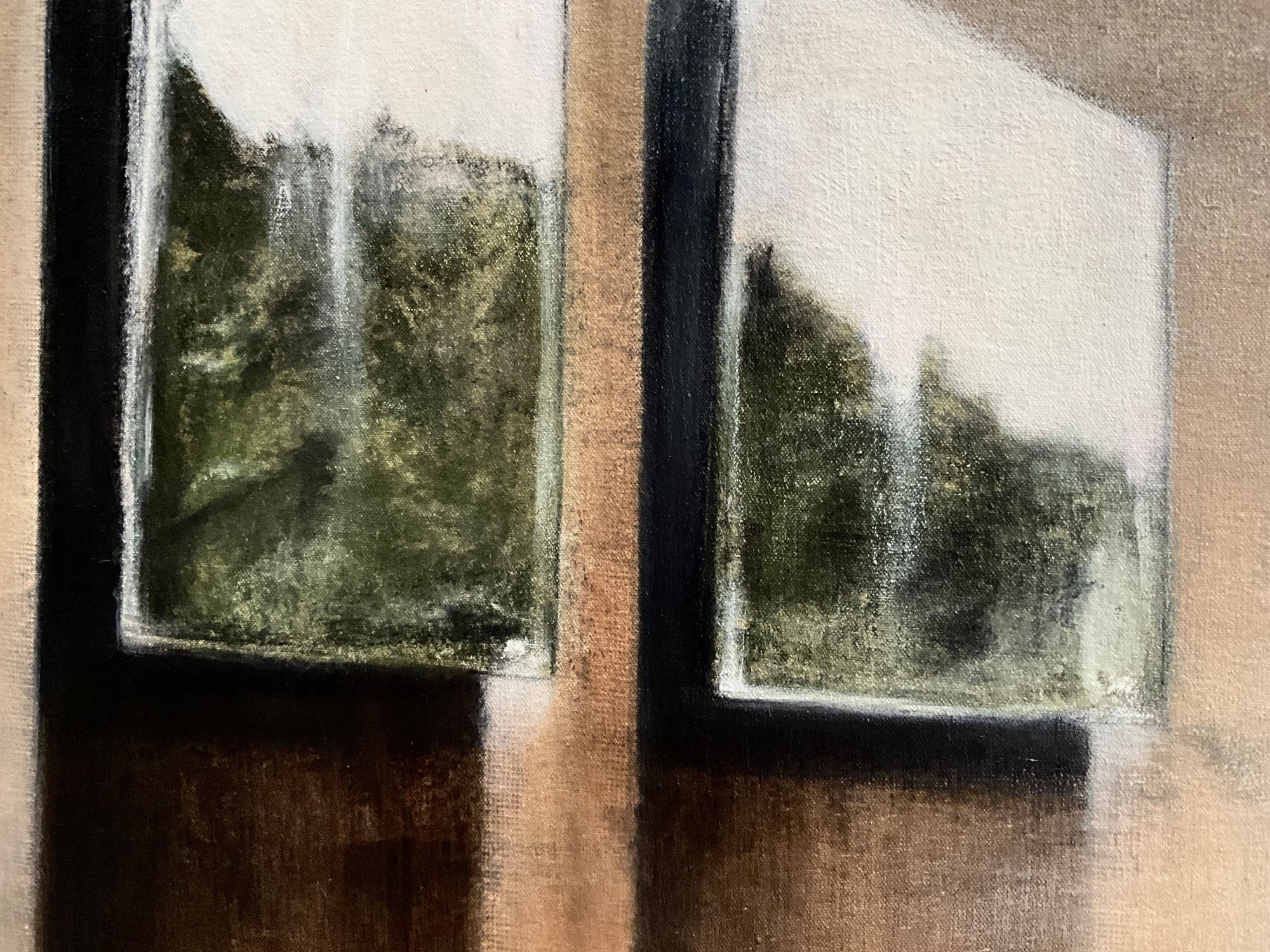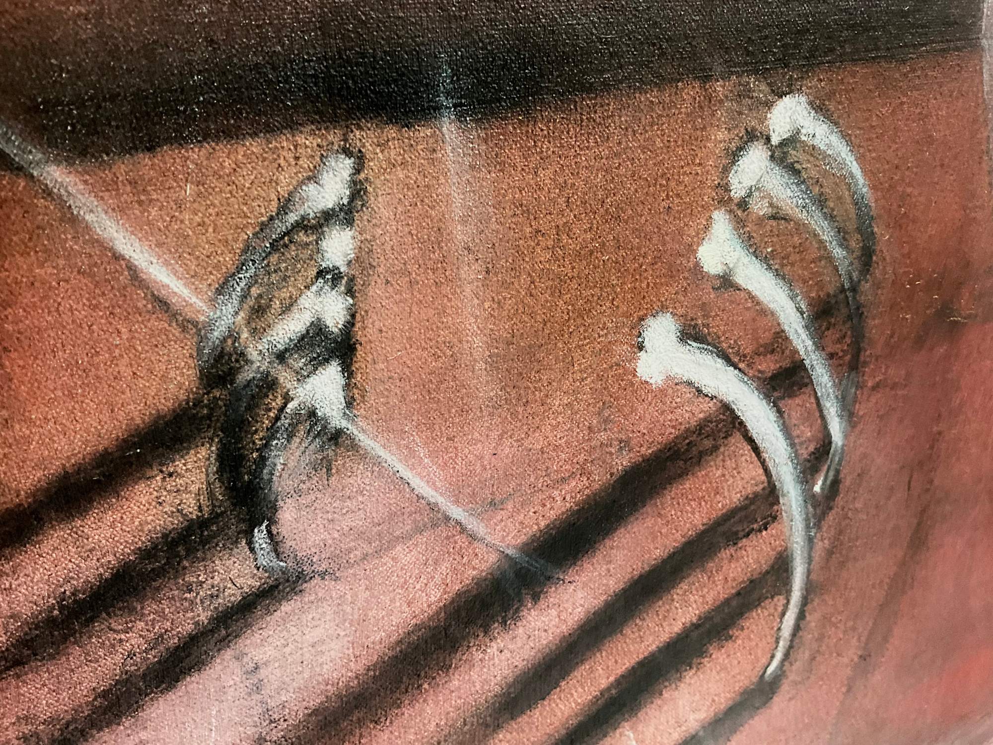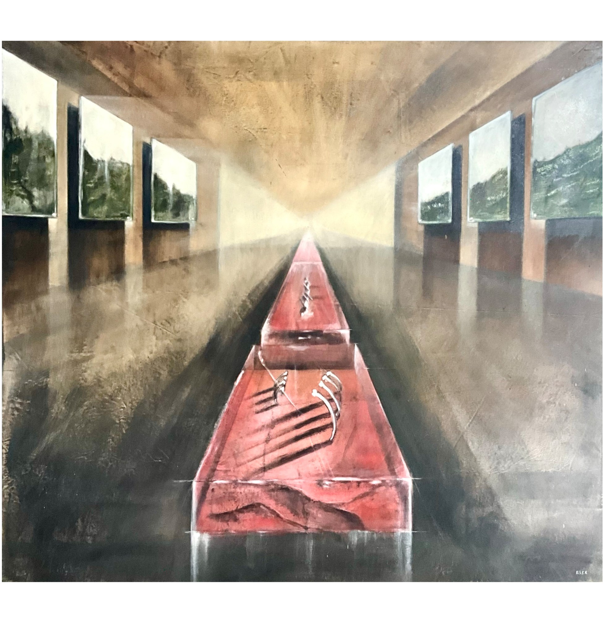 "Synthetic” belongs to the work cycle, Biotope-contained," representing a significant exploration of mortality and conflict through art. Created in 1991, the sculpture titled “Death Beds” features an unsettling yet thought-provoking element—a human carcass fabricated from steel, which evokes the harsh realities of war, particularly reminiscent of the struggles faced during the Gulf War. The second piece of the sculpture incorporates tar, further deepening the narrative of suffering and resilience. In a contemporary reinterpretation, the two floating beds from this original sculpture have been reimagined within an imaginary space adorned with lush rainforest imagery, presented across various screens. This painting serves as a modern iteration of the original sculpture, inviting viewers to engage with the themes of life, death, and the environment in a multifaceted dialogue that spans both time and space.