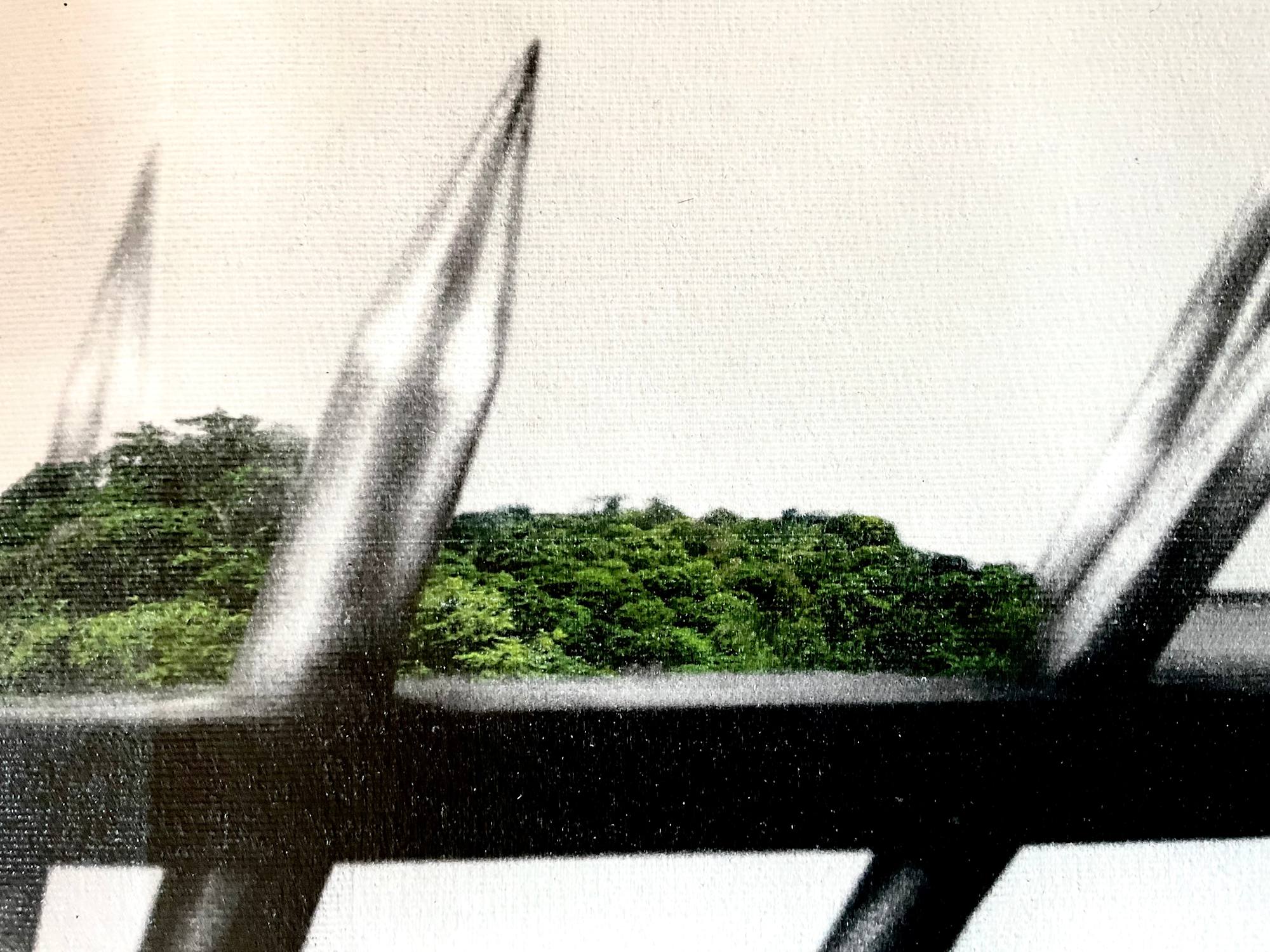 It encapsulates the essence of two worlds: the hard-core industrial phase of modernity and the lush, vibrant fragments of rainforest that nourished the artist's spirit during more then two decades of a life in the jungle. The painting emerges as a sensorial experience, inviting viewers to contemplate the interplay between human ingenuity and the raw beauty of nature. With its intricate detailing and powerful presence, it feels as if "the dish is served," completing a narrative that has long yearned for resolution, a harmonious blend of steel and verdant life that resonates deeply within the observer.