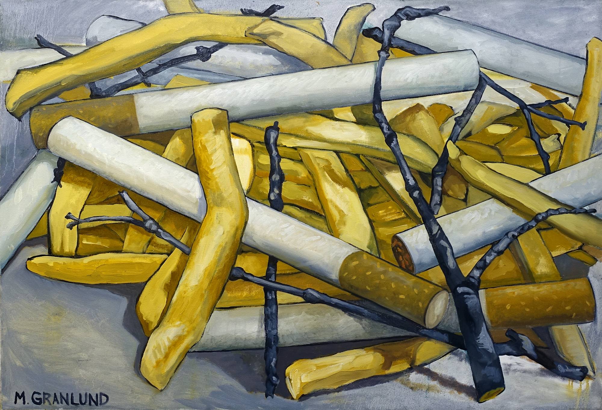 An oil painting on canvas of a pile of cigarettes, twigs and french fries. What is edible? What is healthy? Both difficult questions with the American Diet.