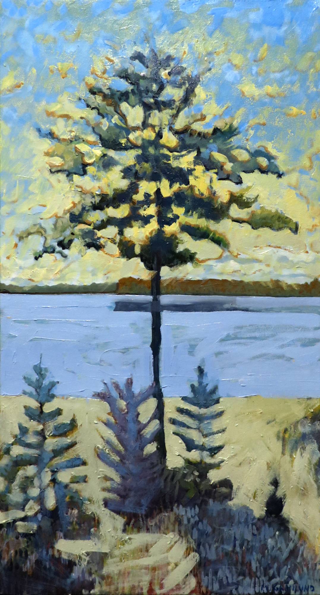 Oil painting of a sunrise behind a tree along the Mississippi River.