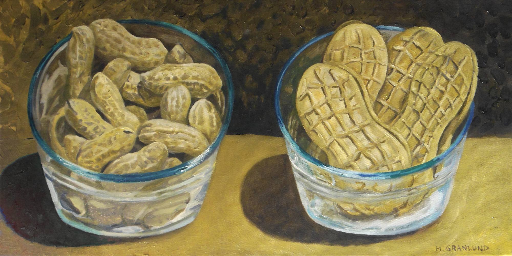 An oil painting of a bowl of real peanuts and one of processed peanut-butter cookies.