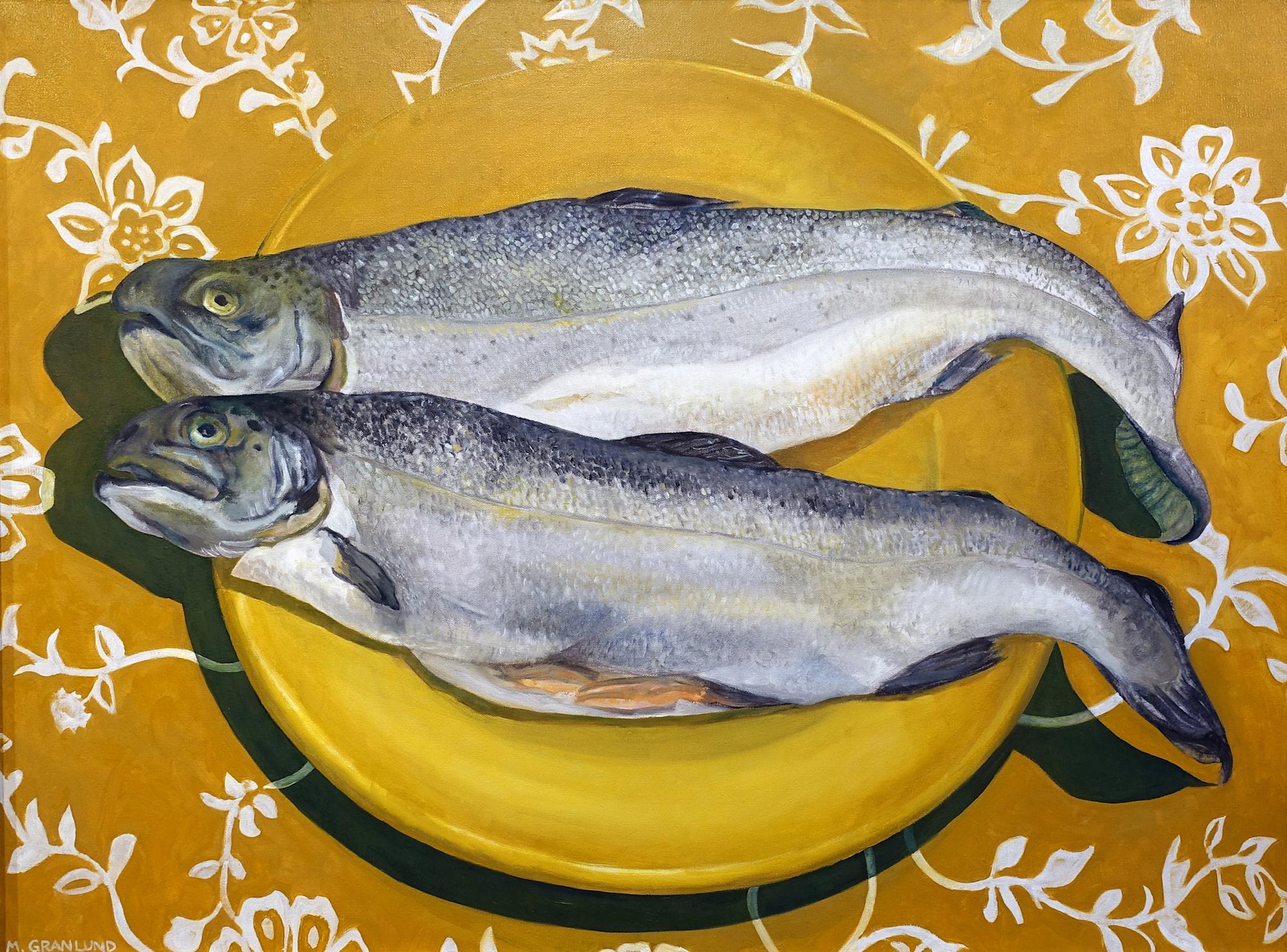 Oil painting on canvas of two fresh-caught rainbow trout on a plate