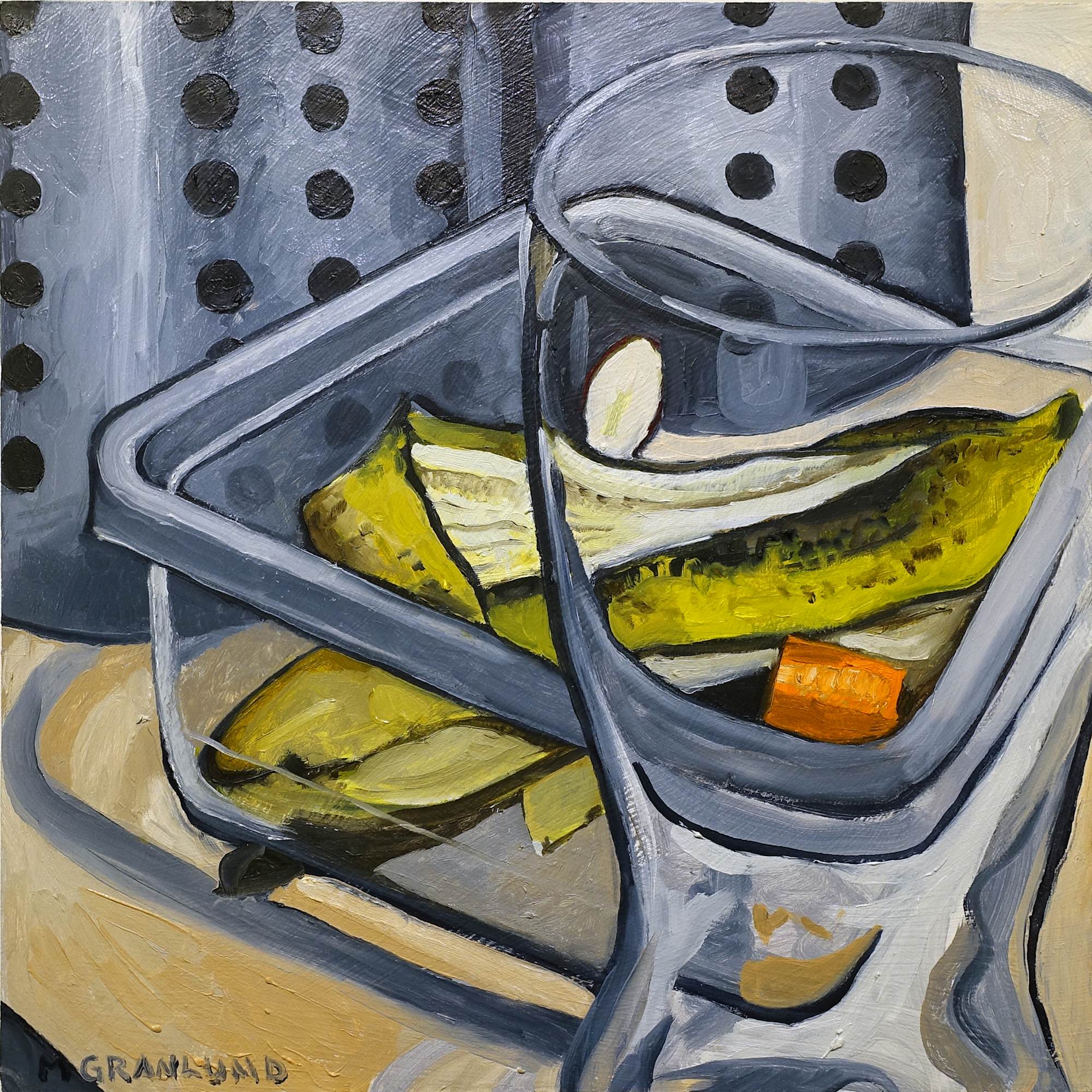 This is an oil painting on a 12" x 12" wood panel of the small container next to my kitchen sink in which I place food scraps before taking them out to my compost bin by my garden. The container includes a banana peel and a piece of carrot. The container is seen behind a glass but in front of cylinders for holding utensils. The image is painted on the front of the panel while the sides, 1.5" deep, are left as natural wood.
