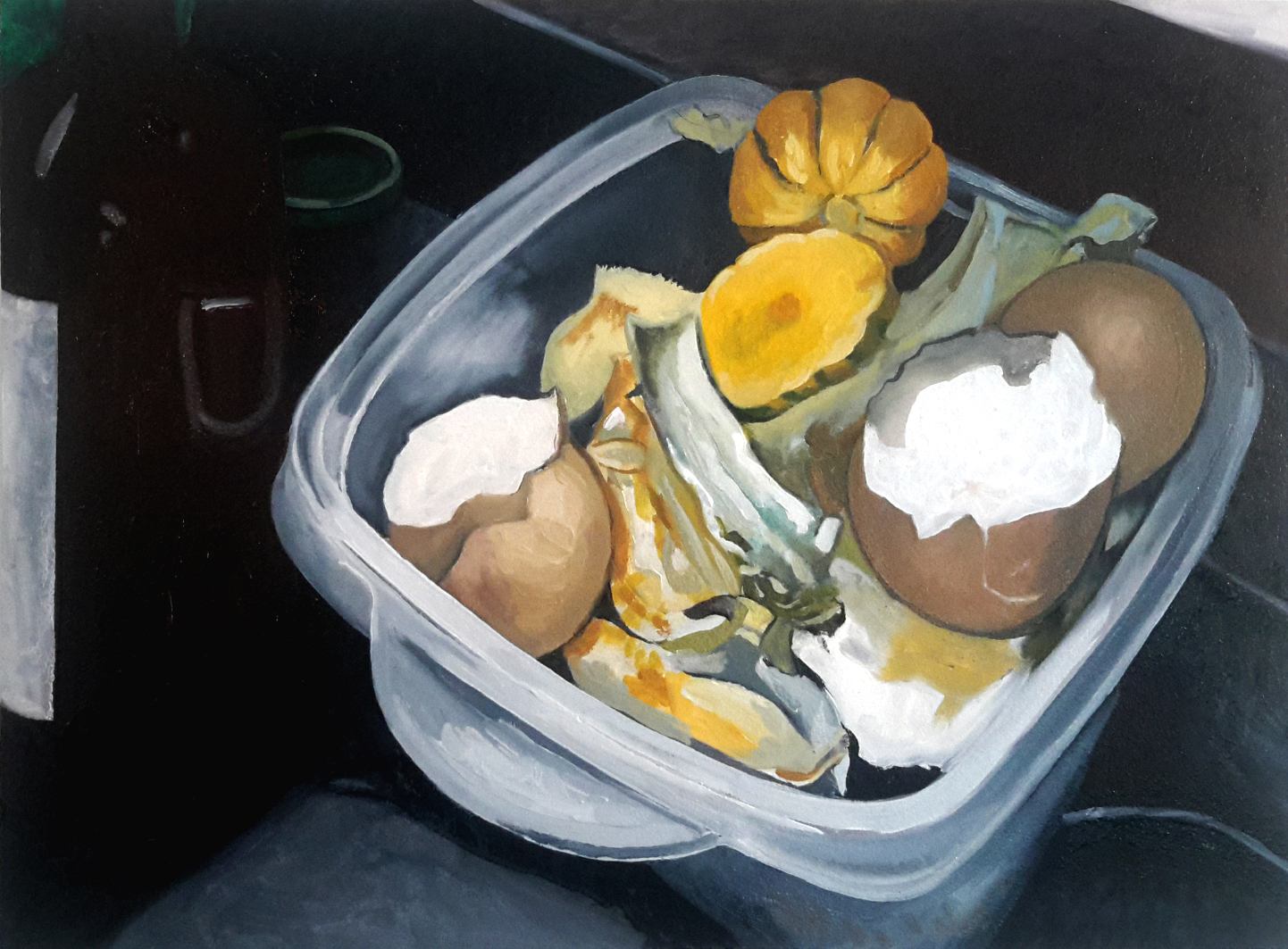 This is an oil painting on 16" x 12" cradled wood panel of the small container next to my kitchen sink in which I place food scraps before taking them out to my compost bin by my garden. This painting includes egg shells and delicata squash rinds.