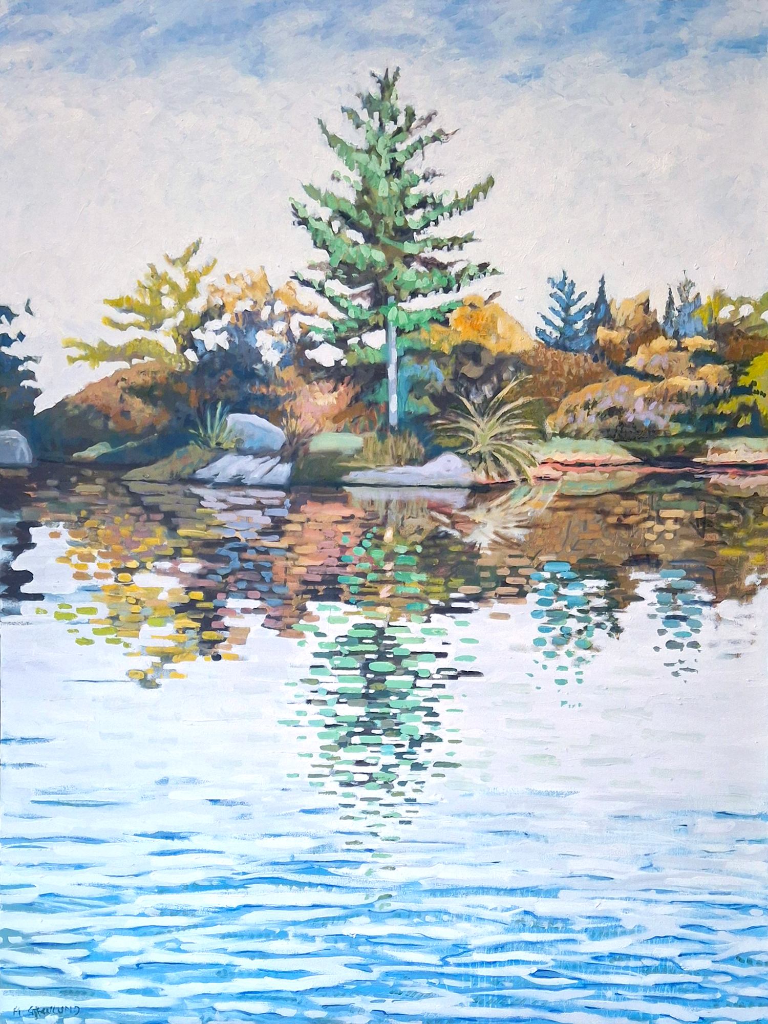 An oil painting of a pine tree reflected in a calm lake. The abstraction of the tree in the water is the spirit of the tree, thus abstracted.