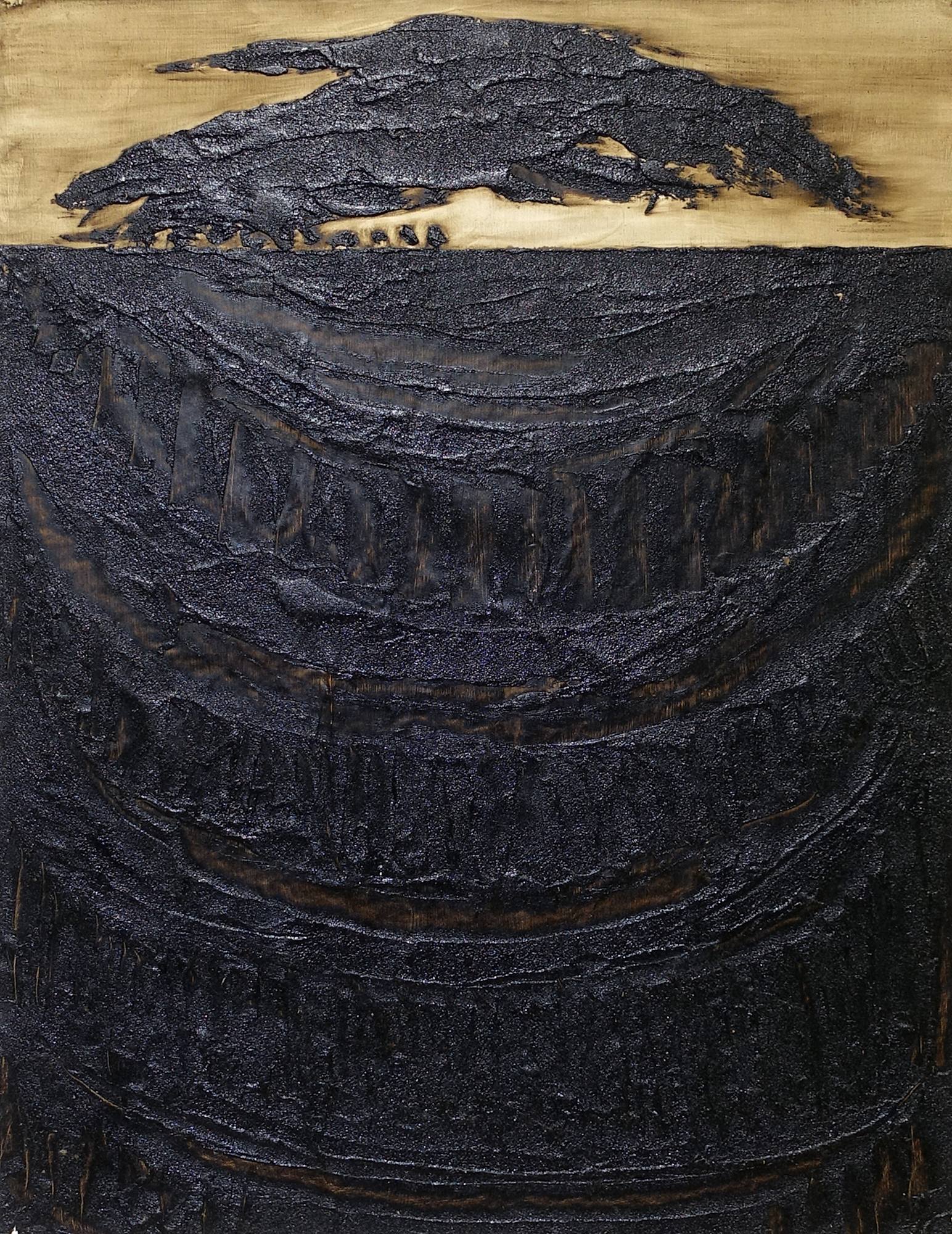 A painting of a sunset behind a cloud over a field made with tar.