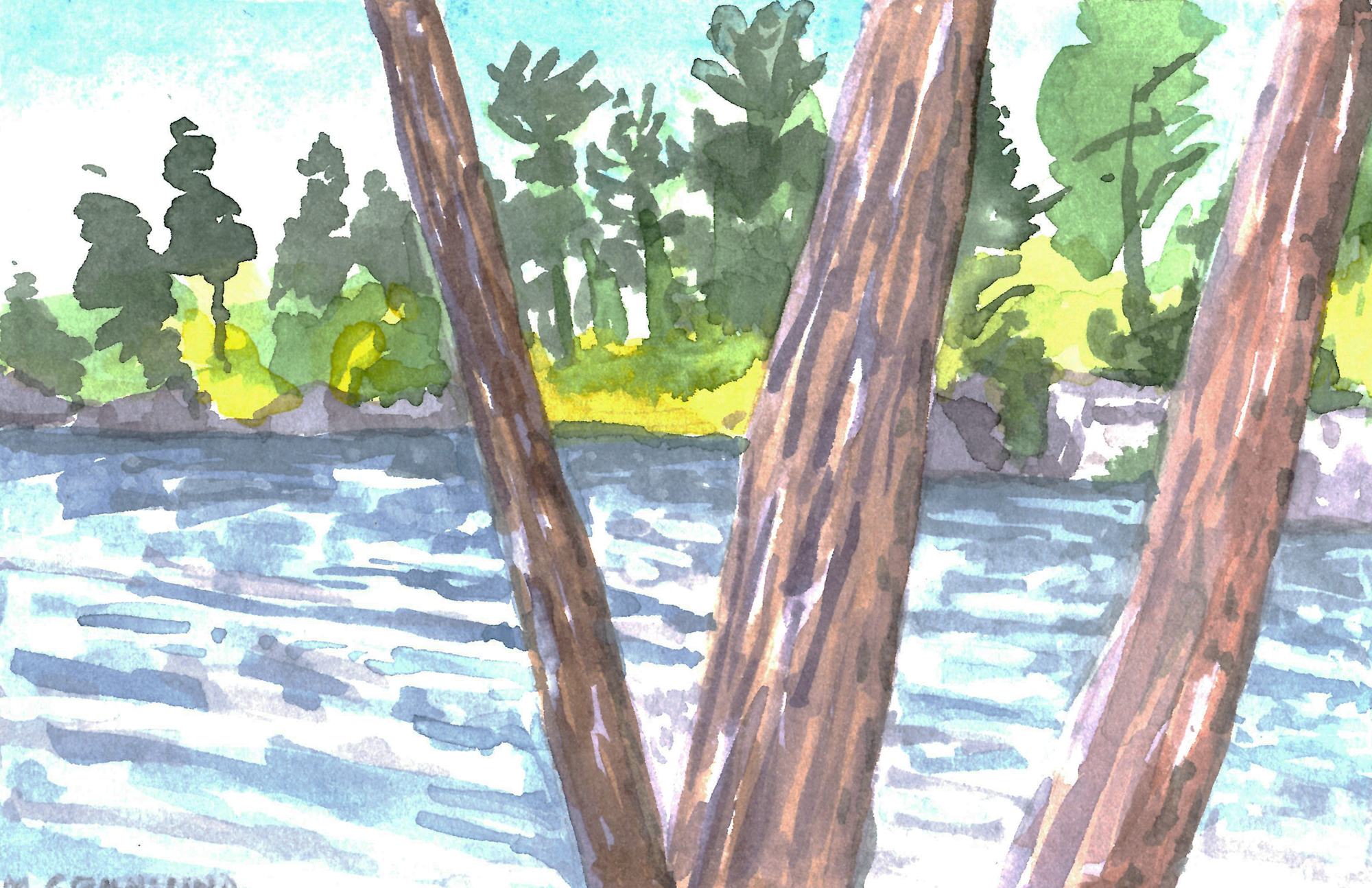 Gouache painting of three cedar trunks by a lake in Northern Minnesota Framed in grey frame.