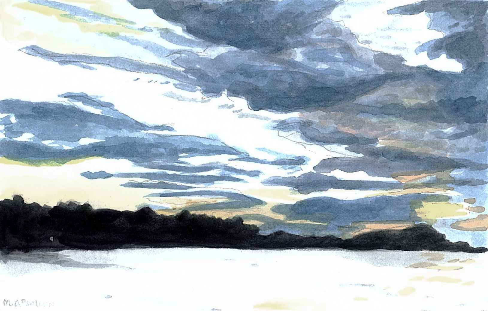 Gouache painting of a morning on a lake in Northern Minnesota Framed in grey frame.
