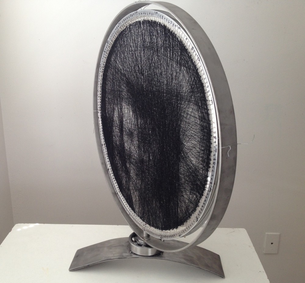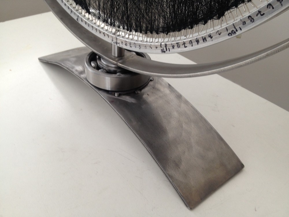This sculptural piece, a tribute to a strong woman, is made from reclaimed materials including industrial bearings, steel, an aluminum bicycle rim, paper clips, and sewing thread.