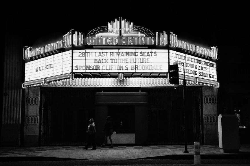 The downtown United Artists Theater was opened in 1927 by its founders Charlie Chaplin, Douglas Fairbanks, and Mary Pickford; who needed the massive Spanish Gothic style movie palace as a venue for the world premiere of their movies, when the United Aritist was finally closed in 1989 as a movie theater It was then sold and used for many years as a church for the Los Angeles University Cathedral and the churches founder Dr. Gene Scott who also installed the famous "Jesus Saves" neon signs and did a painstaking restoration of the theater.
