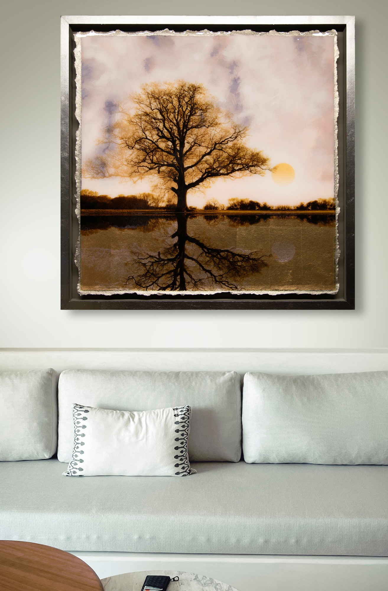 The Reflect collection explores the colour and changing light of seasons on the Symmetree Oak. Each is an impression of memories spent studying the oak tree during the 3 years that Mark photographed it. He uses an original technique that he developed to combine both print, mixed media and painting in resin on paper.