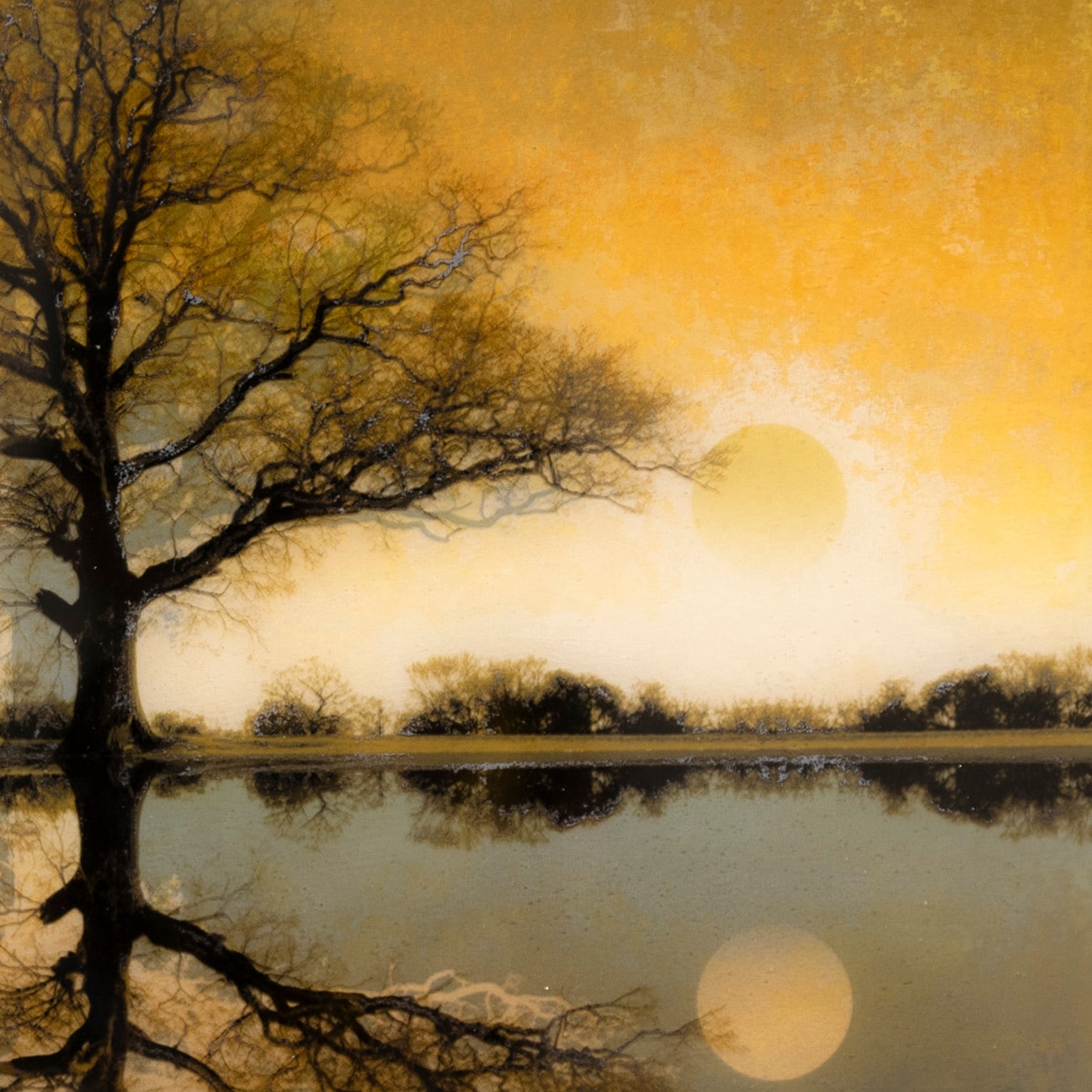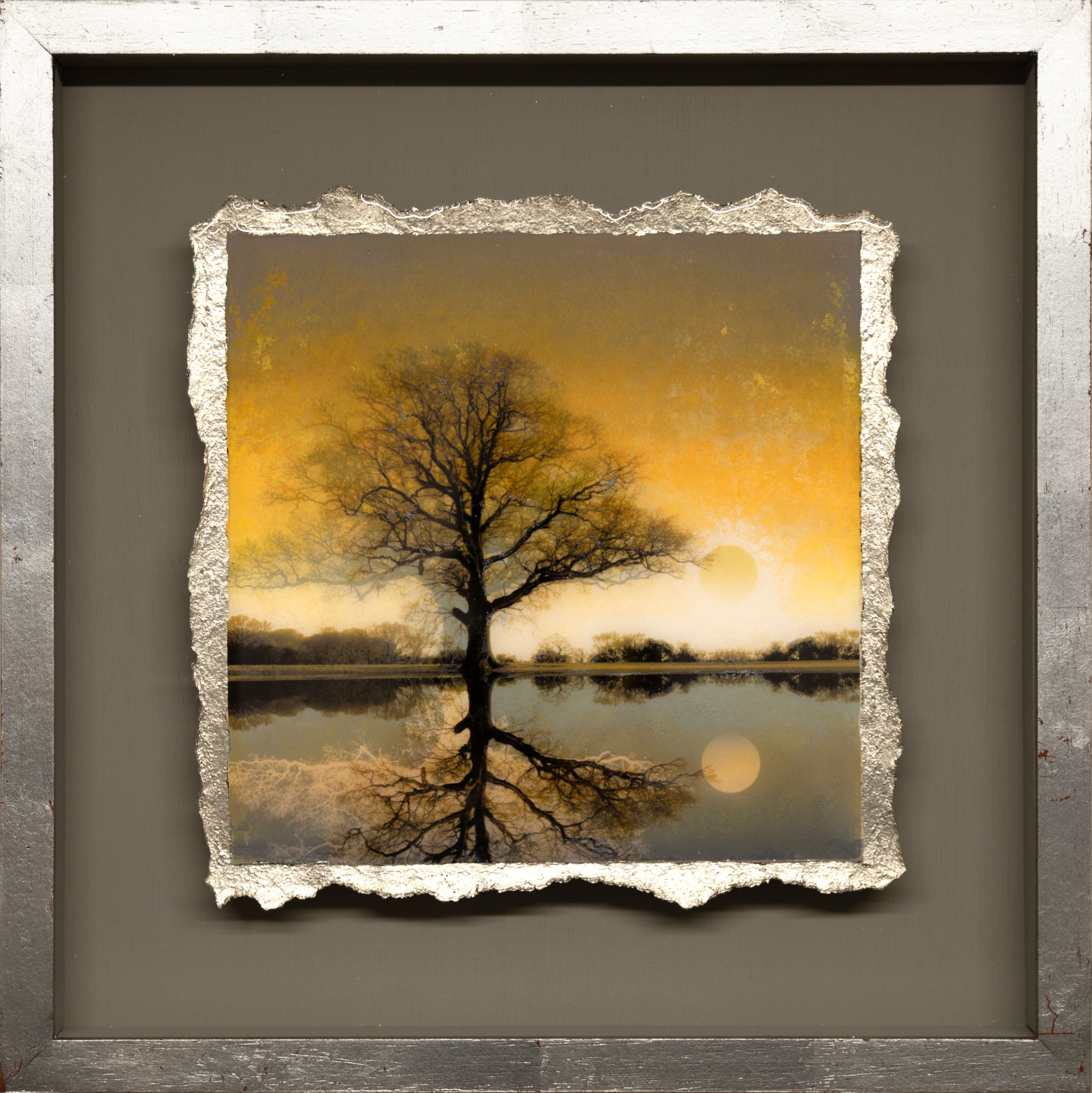 The Reflective Practice collection are smaller pieces exploring the colour and changing light of seasons on the Symmetree Oak. Each is an impression of memories spent studying the oak tree during the 3 years that Mark photographed it. He uses an original technique that he developed to combine both print, mixed media and painting in resin on paper.