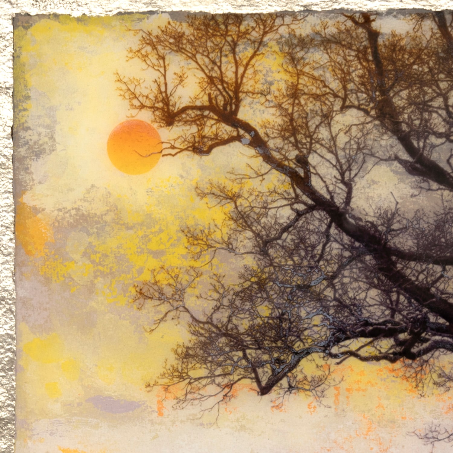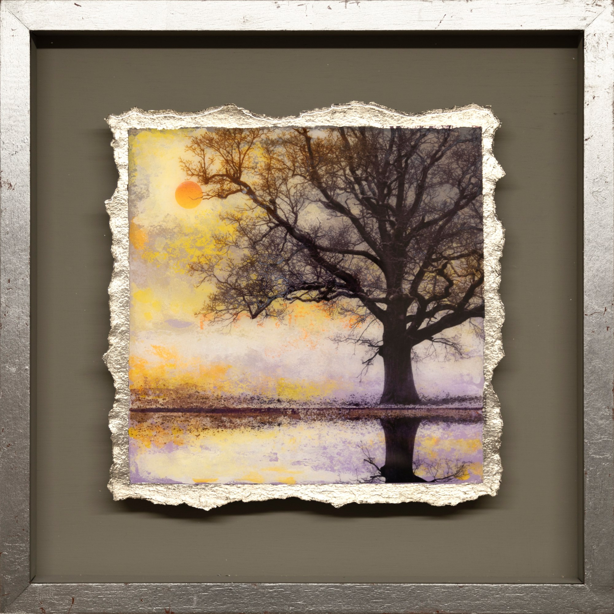 The Reflective Practice collection are smaller pieces exploring the colour and changing light of seasons on the Symmetree Oak. Each is an impression of memories spent studying the oak tree during the 3 years that Mark photographed it. He uses an original technique that he developed to combine both print, mixed media and painting in resin on paper.
