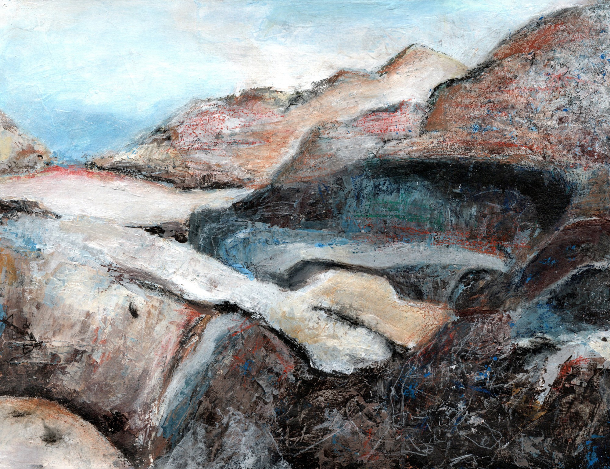I adore exploring the boulders at Ocean Beach during low tide. Serpentine rocks, piled like shipwrecks, form a channel for the tempestuous sea. This abstract seascape draws inspiration from the patterns I found in the rocks and sand.