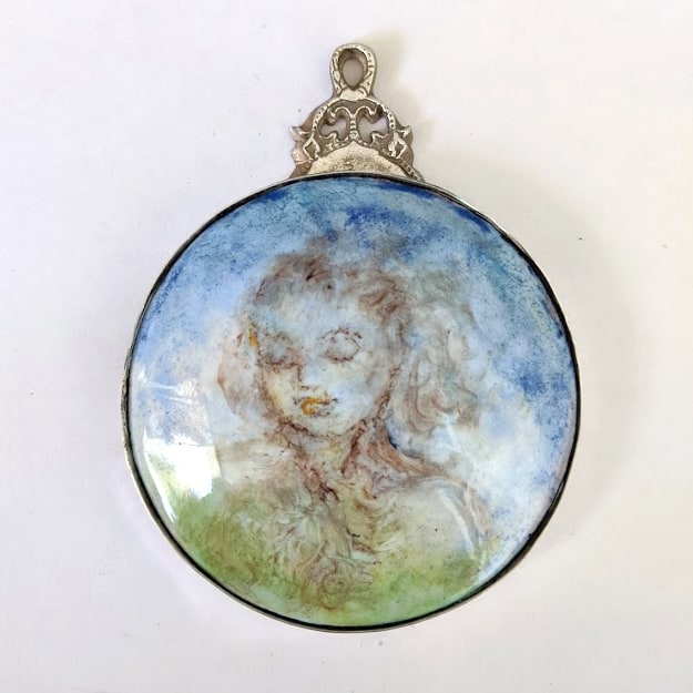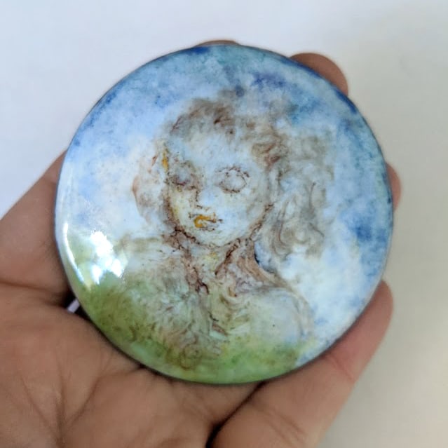 An enamel Painting made by melting layers of glass on copper. With Silver Frame