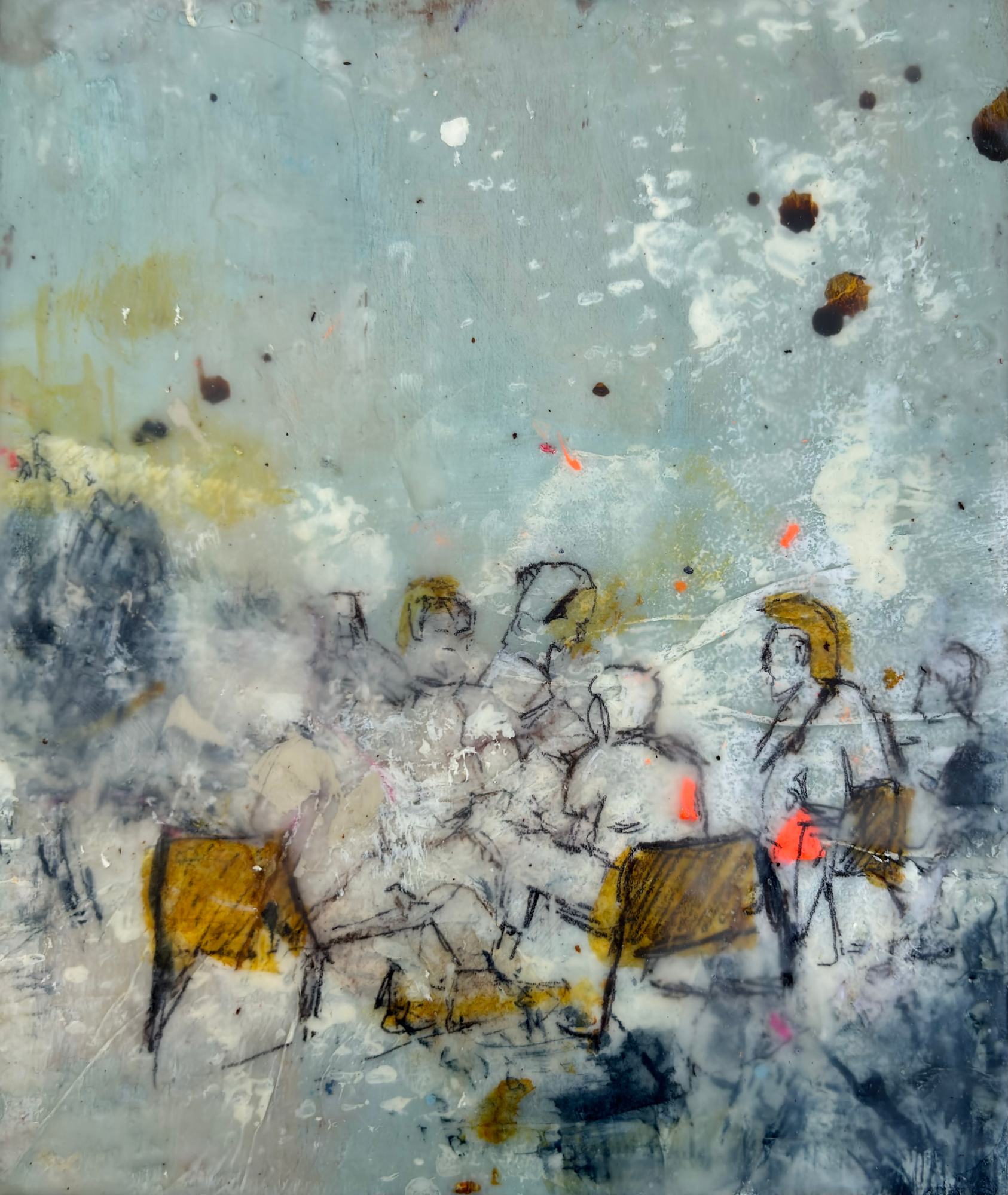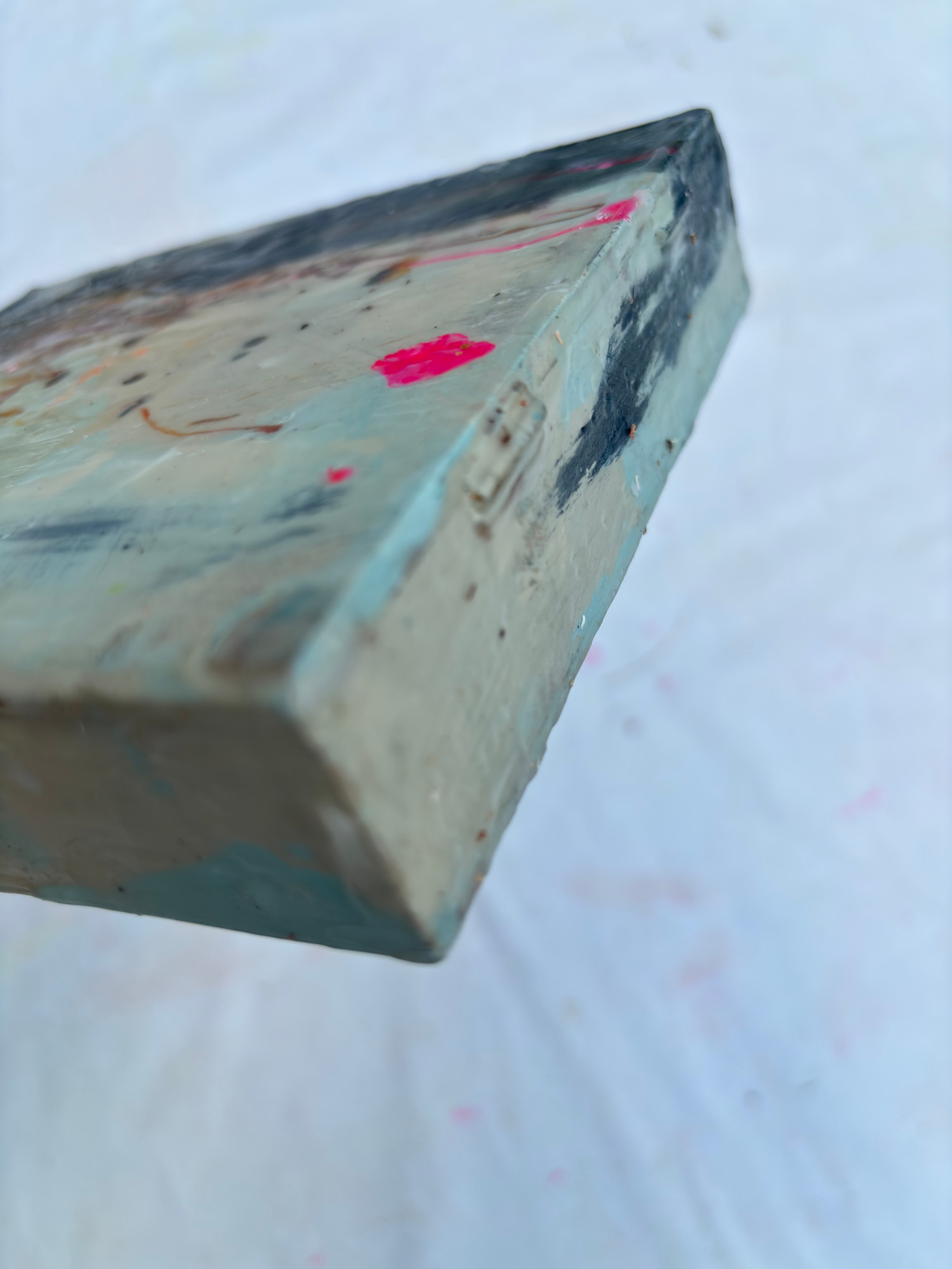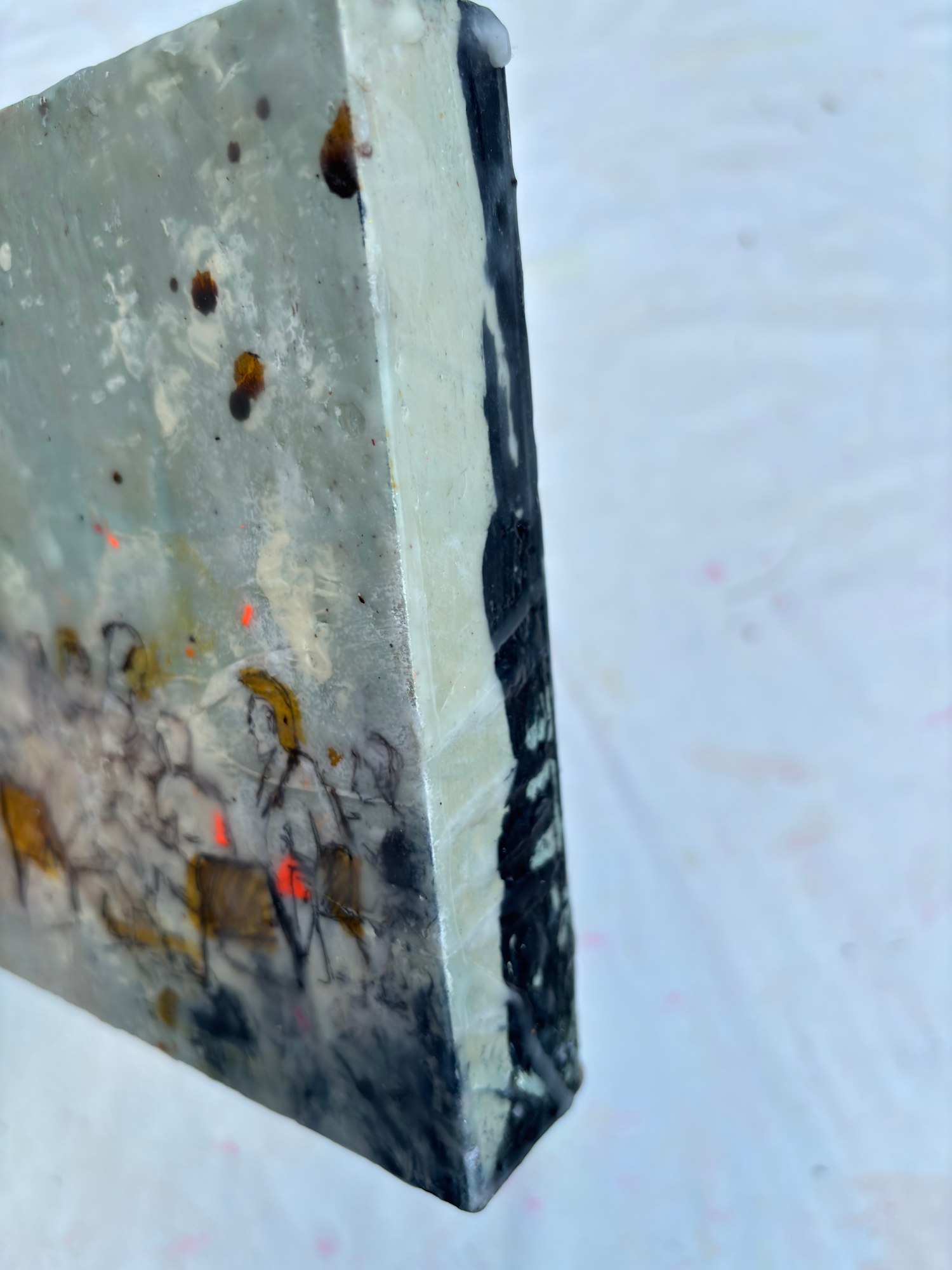 Work on stand; Please Note: The wax used in this artwork is sensitive to heat. Exposure to heat sources such as heaters or direct sunlight may cause the wax to melt, which can alter the appearance of the piece.