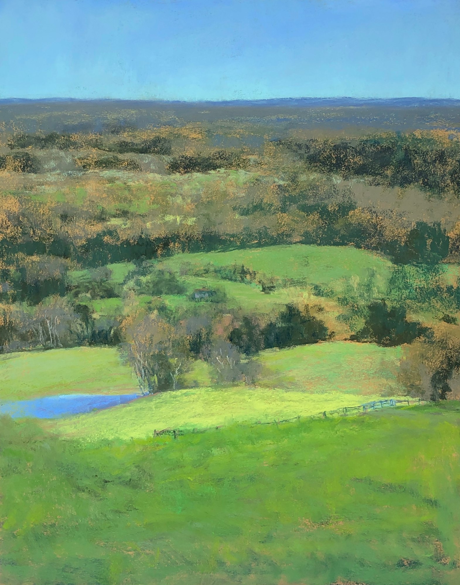 Participating in a plein air event in Meriwether County on top of a very high hill was a treat. You don’t expect to see this high point in the middle of Georgia. I focused on the patchwork quality of the distant layers of trees, fields and approaching my location on top of a hill looking down at grass and a small pond. What an awesome view it was, both simple and complicated at the same time.