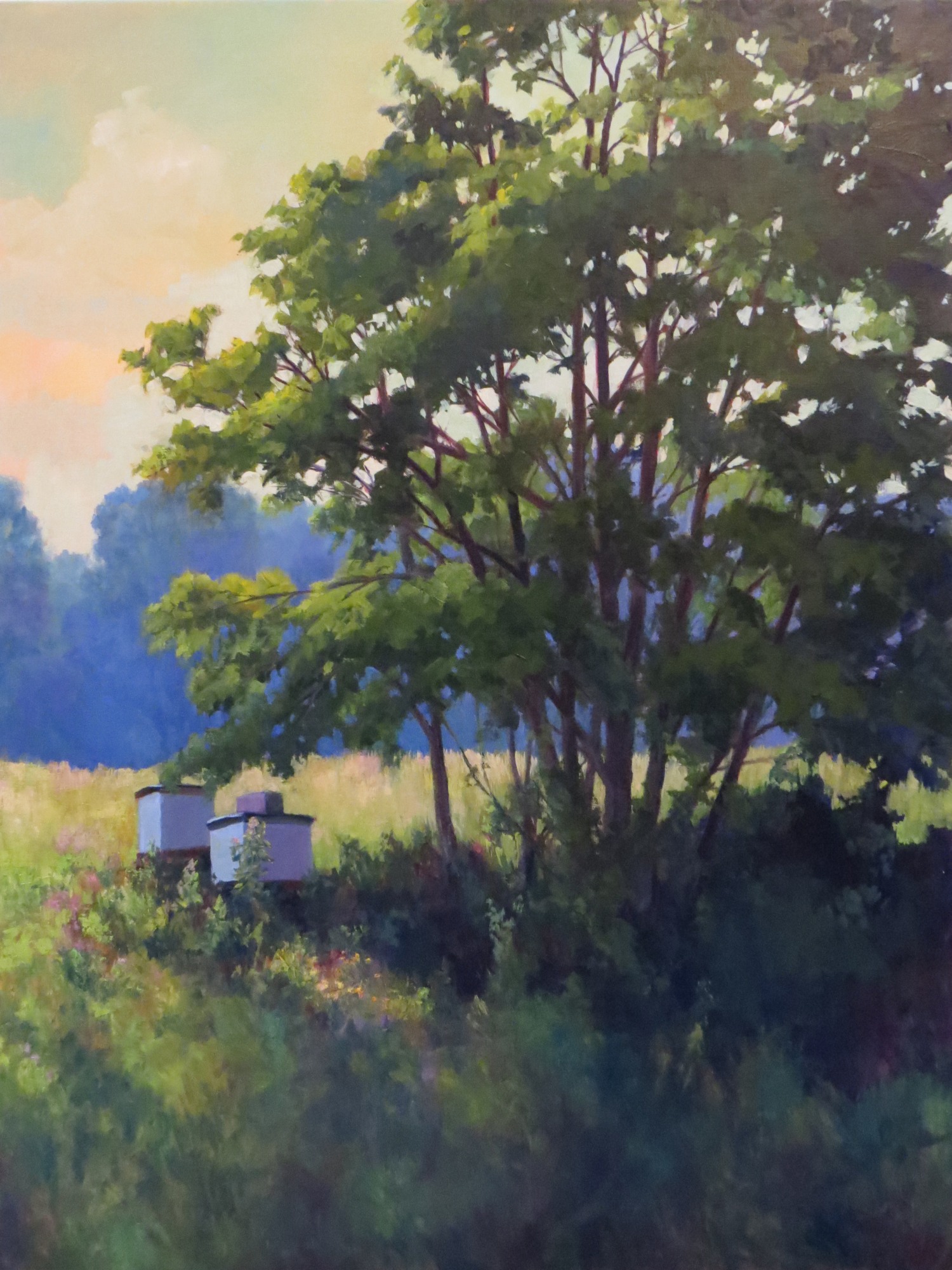 This painting was done from a photograph taken near Blue Ridge, GA. I painted several paintings on location of these dogwood trees and hives. It always intrigues me to create another painting of the area. Dogwood trees are my favorite tree to paint because of the multiple tree trunks creating all the wonderful “air holes” to look through. Enjoy!