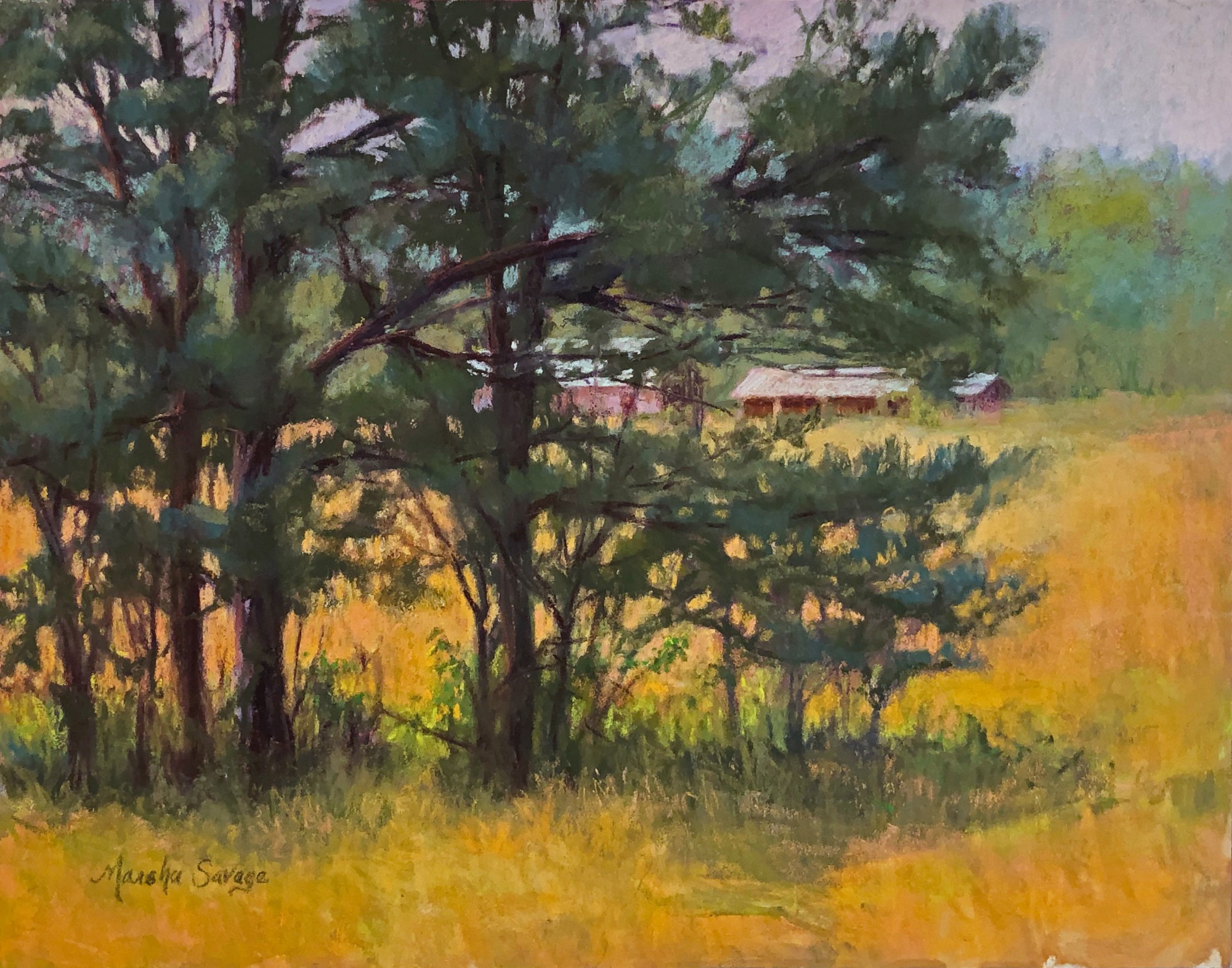 This painting is a combination of one photo showing a tree and pasture scene in North Georgia, and a few of my memories of buildings you can see in the distance through trees. I thoroughly enjoy painting pine trees with all the interesting “air holes” you can see through to the background. I love the mystery of thinking about who worked in those farm buildings I added and how long ago it may have been. It has to have a story!