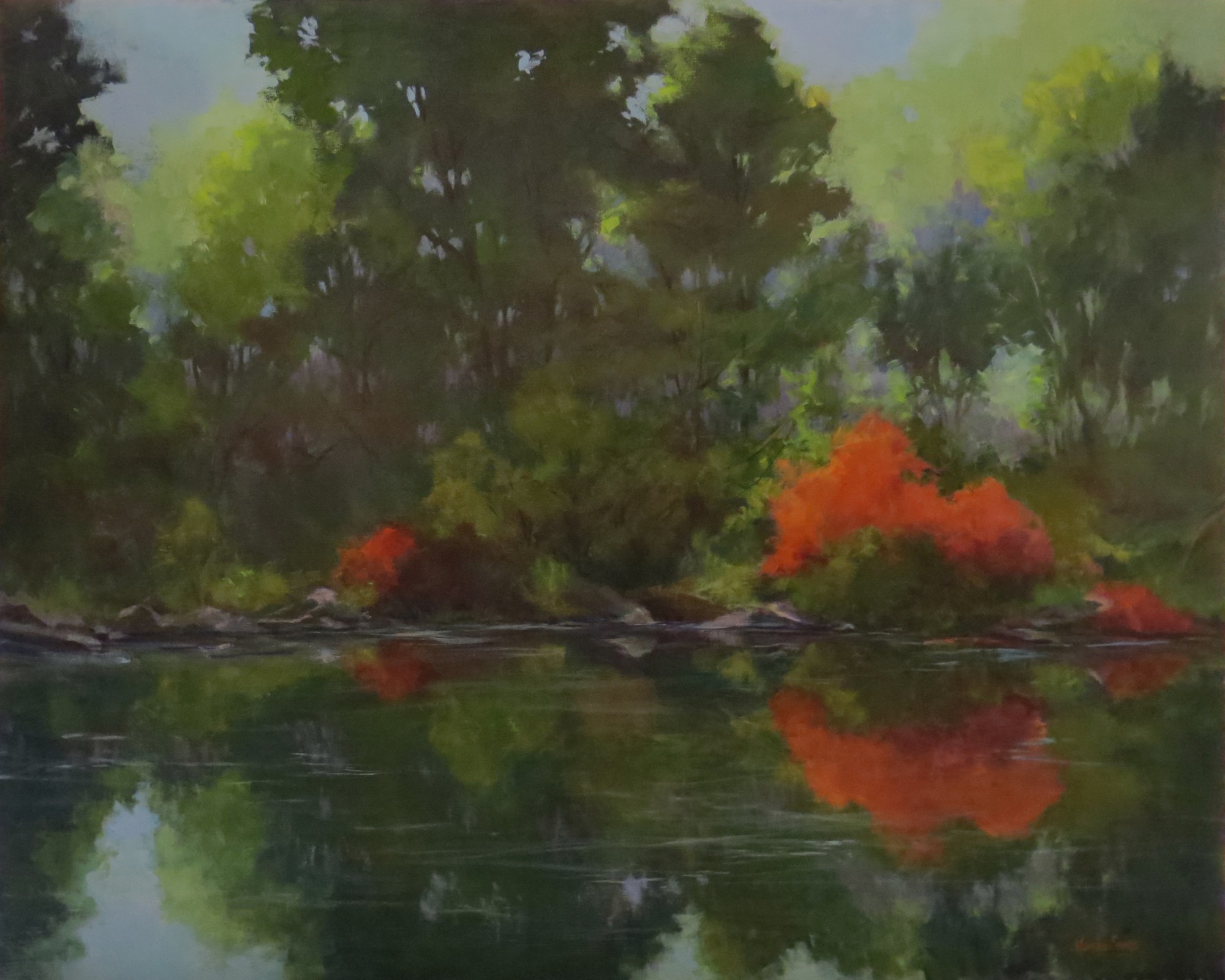 This started out as a scene from North Georgia, and across the Toccoa River where I paint often. There was the railroad track just on the other side up a small bank. I was not happy with that part of the painting and changed it to create just woods. It needed something, so I decided there are riverside bushes that have a red quality to them, and put an exaggerated version of them. Red and green are opposites on the color wheel so it made for a wonderful contrast.