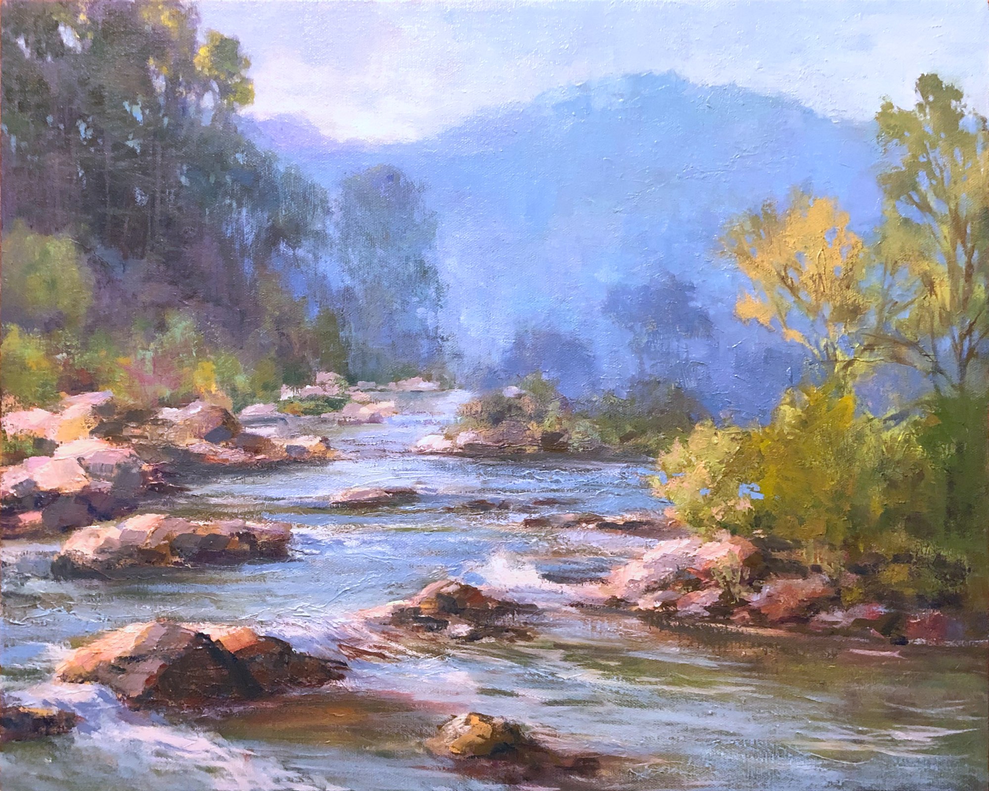 This scene started out with a photo from North Georgia but it evolved into a combination of two different rivers I had photos of. I enhanced the distance in this one rather than have the closed in mountain feeling we have in the North Georgia mountains. I like the openness of what I finally achieved here and felt it made a better painting!