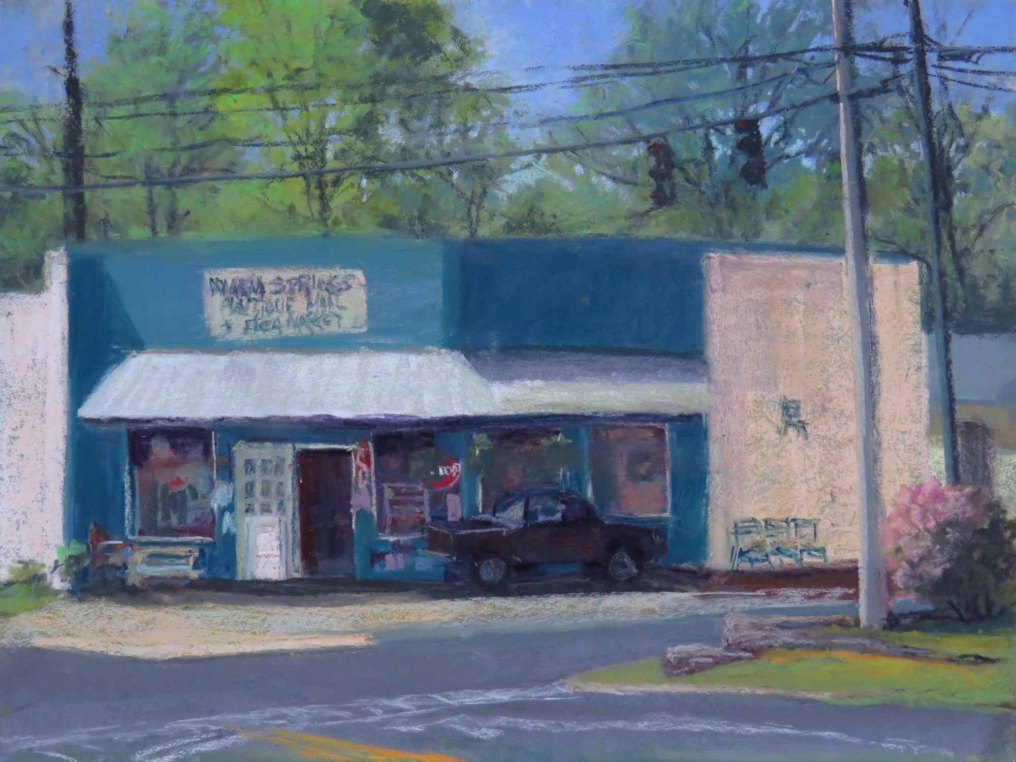 This pastel was done on location at the Open Air Meriwether Plein Air paint out near Greenville GA. This event is to help bring art to a county in Georgia that does not have much in the way of art for the children in the schools. I had painted on the Roosevelt property that morning, but found this wonderful old gas station in town at Warm Springs after lunch. It had been converted to an Antique Mall... of course we did a little shopping while in the store also! Great scene in this unique little Georgia town.