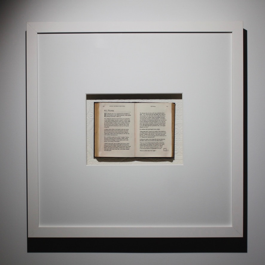 In this series I write a short story or poem and then illustrate it as if it were text in a book page. The typography and styling is similar to the book that I use to tip the draw text page into so that the end presentation looks from afar that it is simply a book in a shadowbox. But in fact it is my writing expressed as a drawing that allows the viewer to create their own image in their heads concerning the composition.