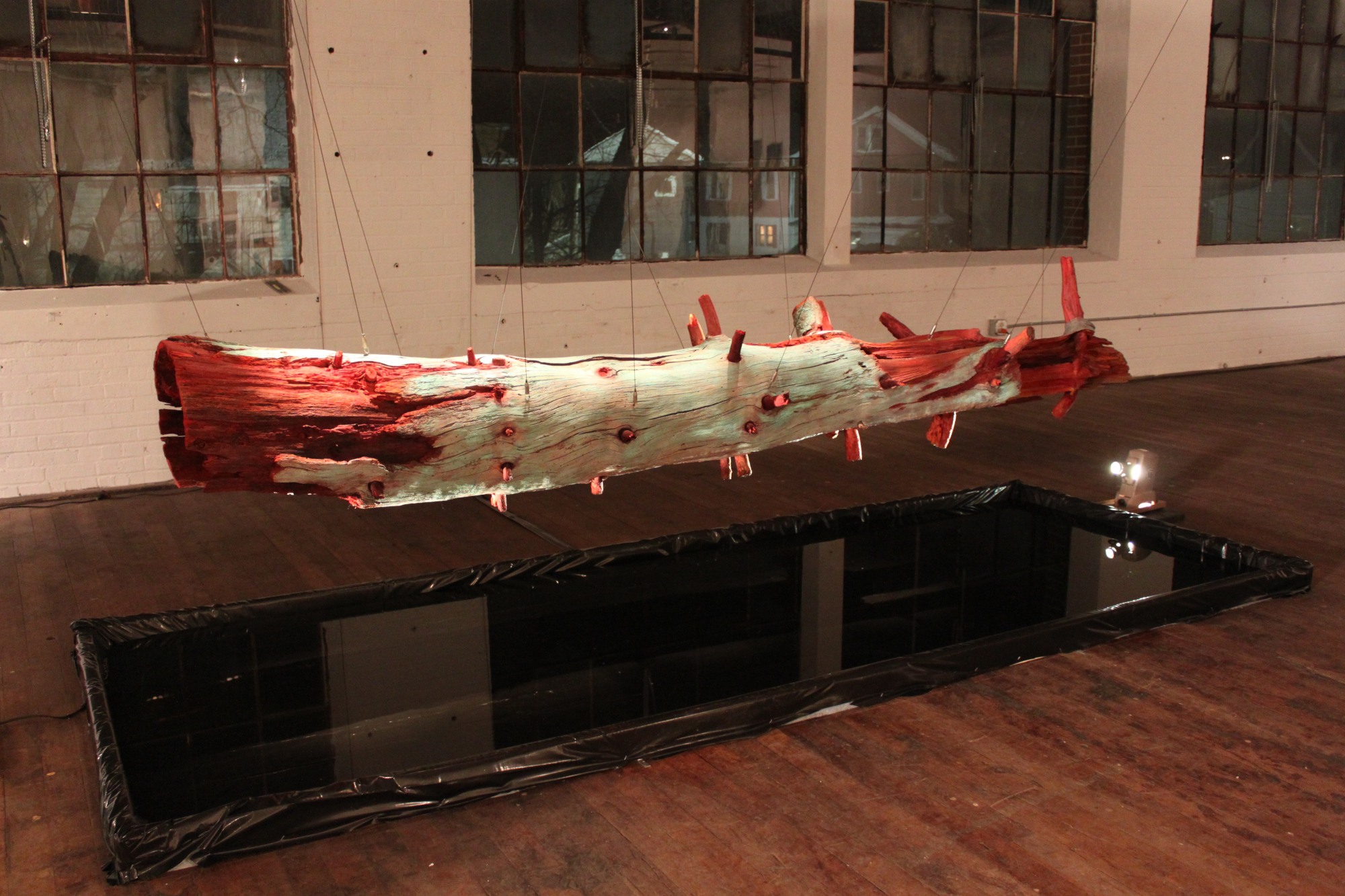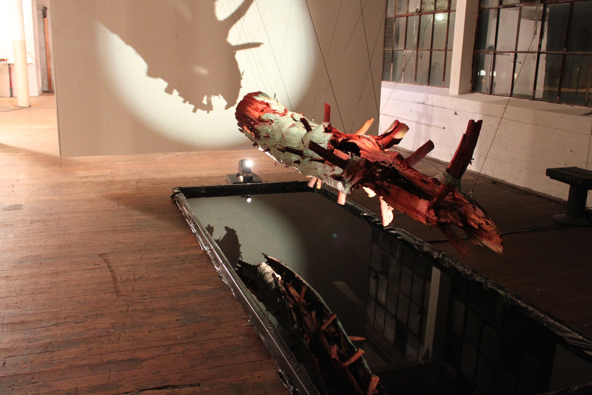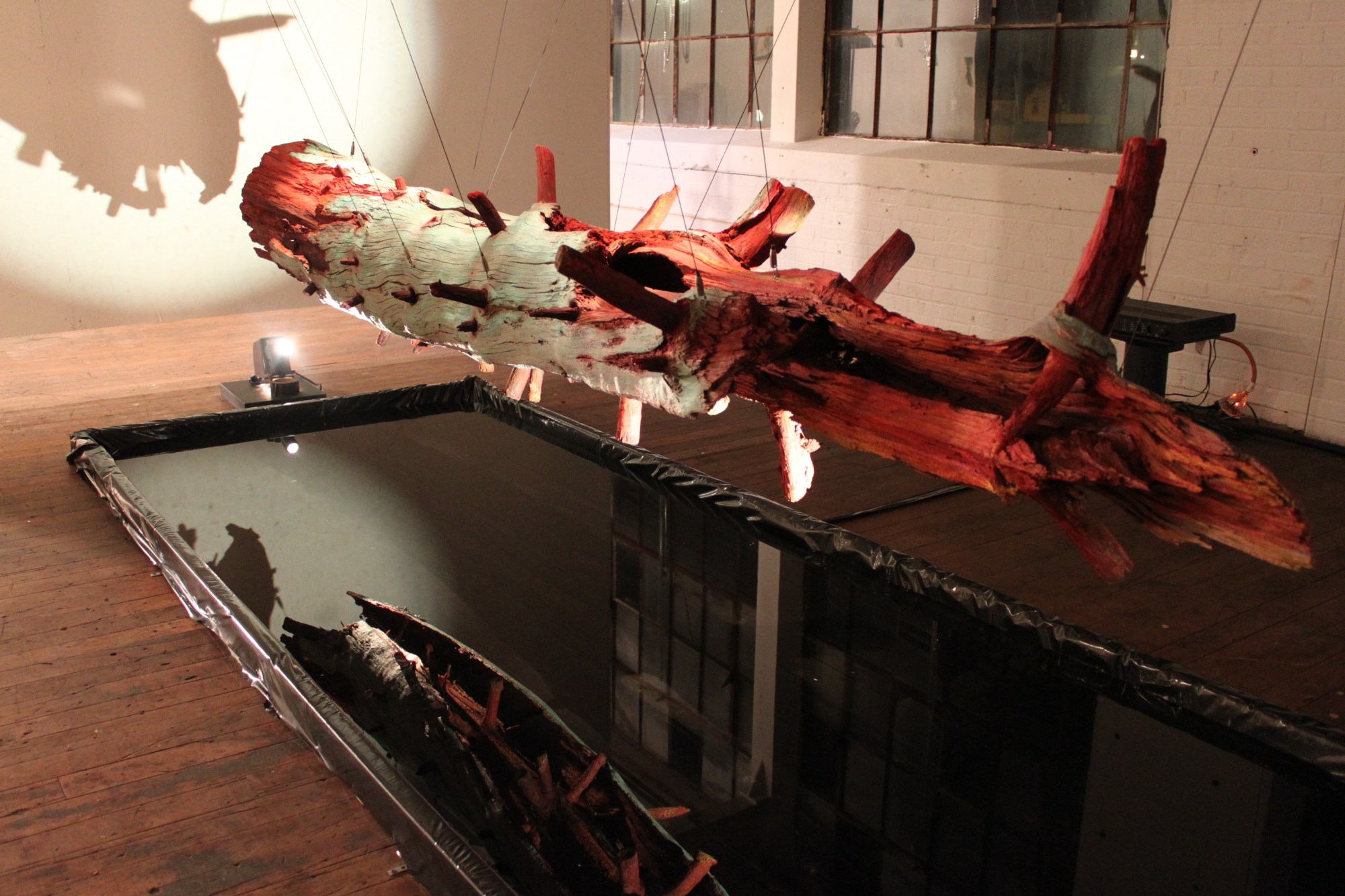 A found object suspended over a reflecting pool. One must look into the pool to see the underside revealing a spinal column like interior