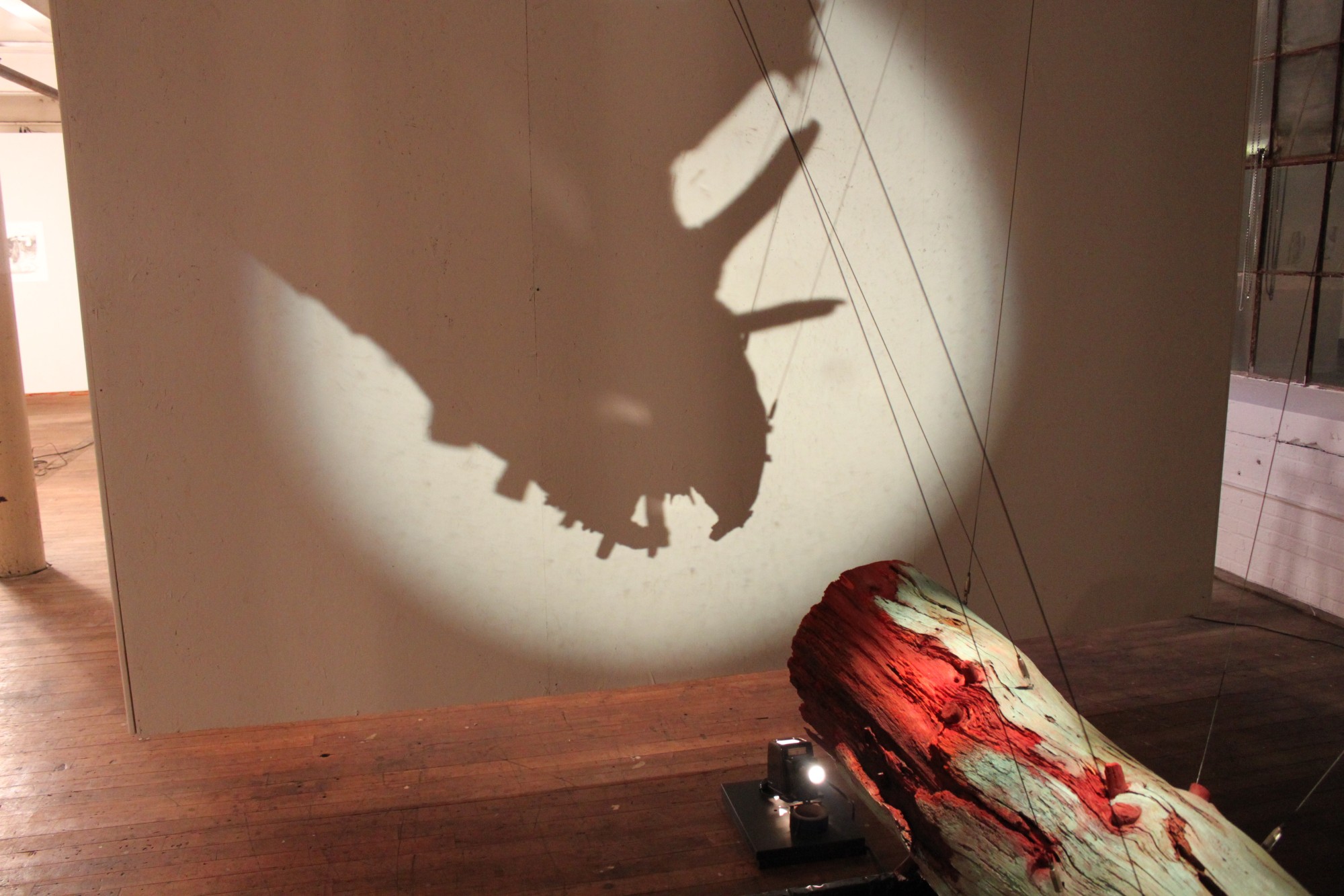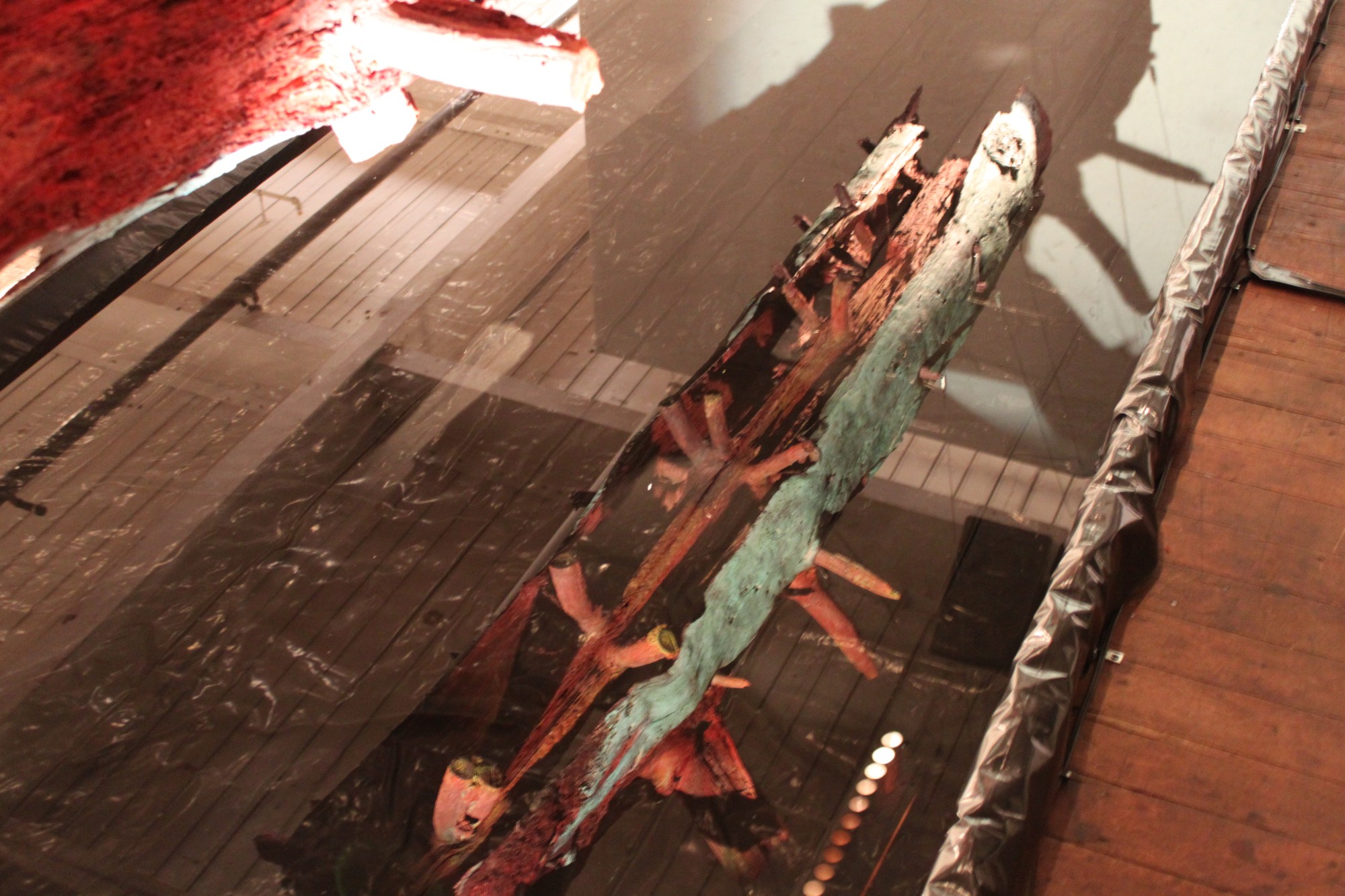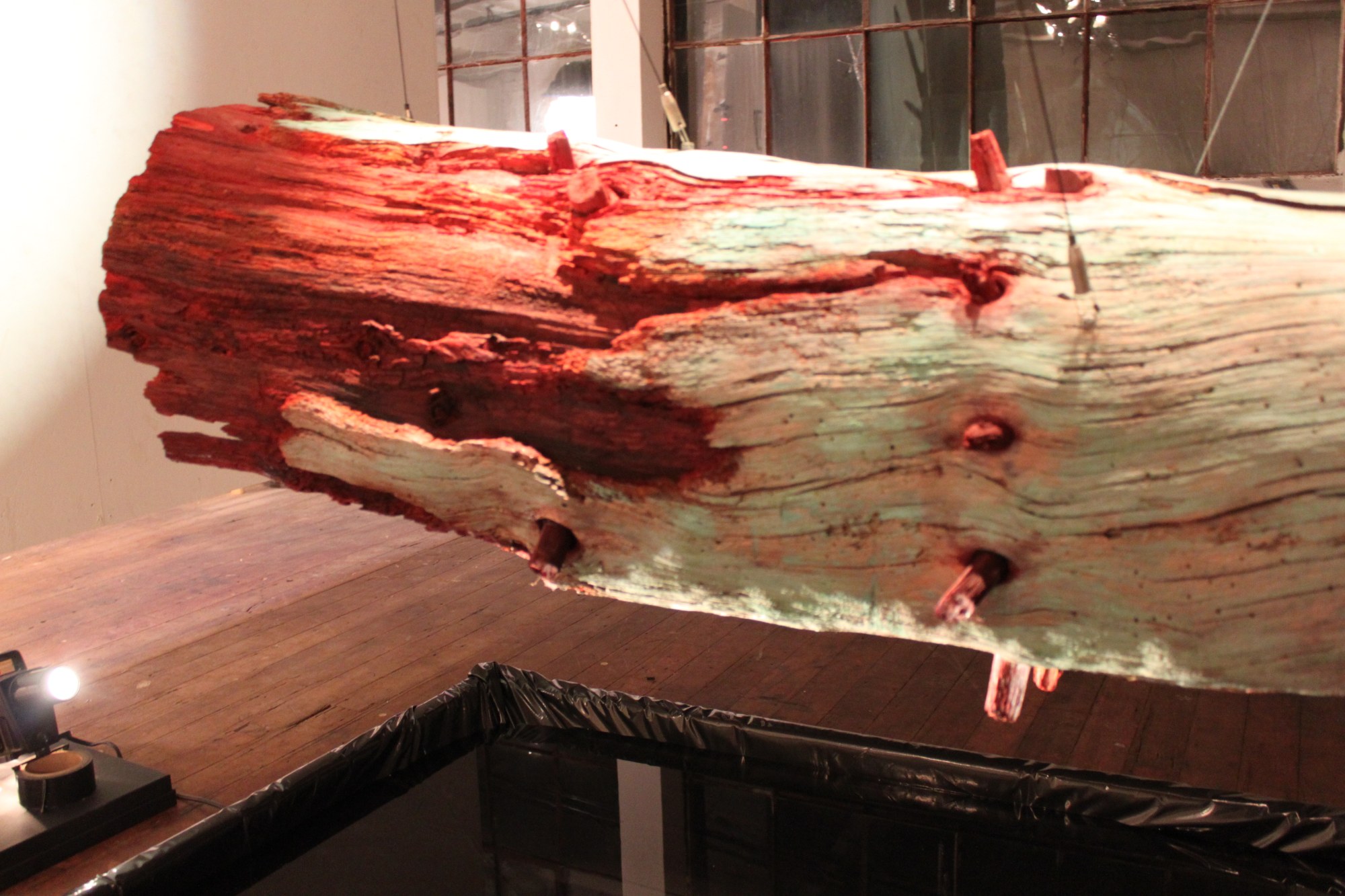 A found object suspended over a reflecting pool. One must look into the pool to see the underside revealing a spinal column like interior