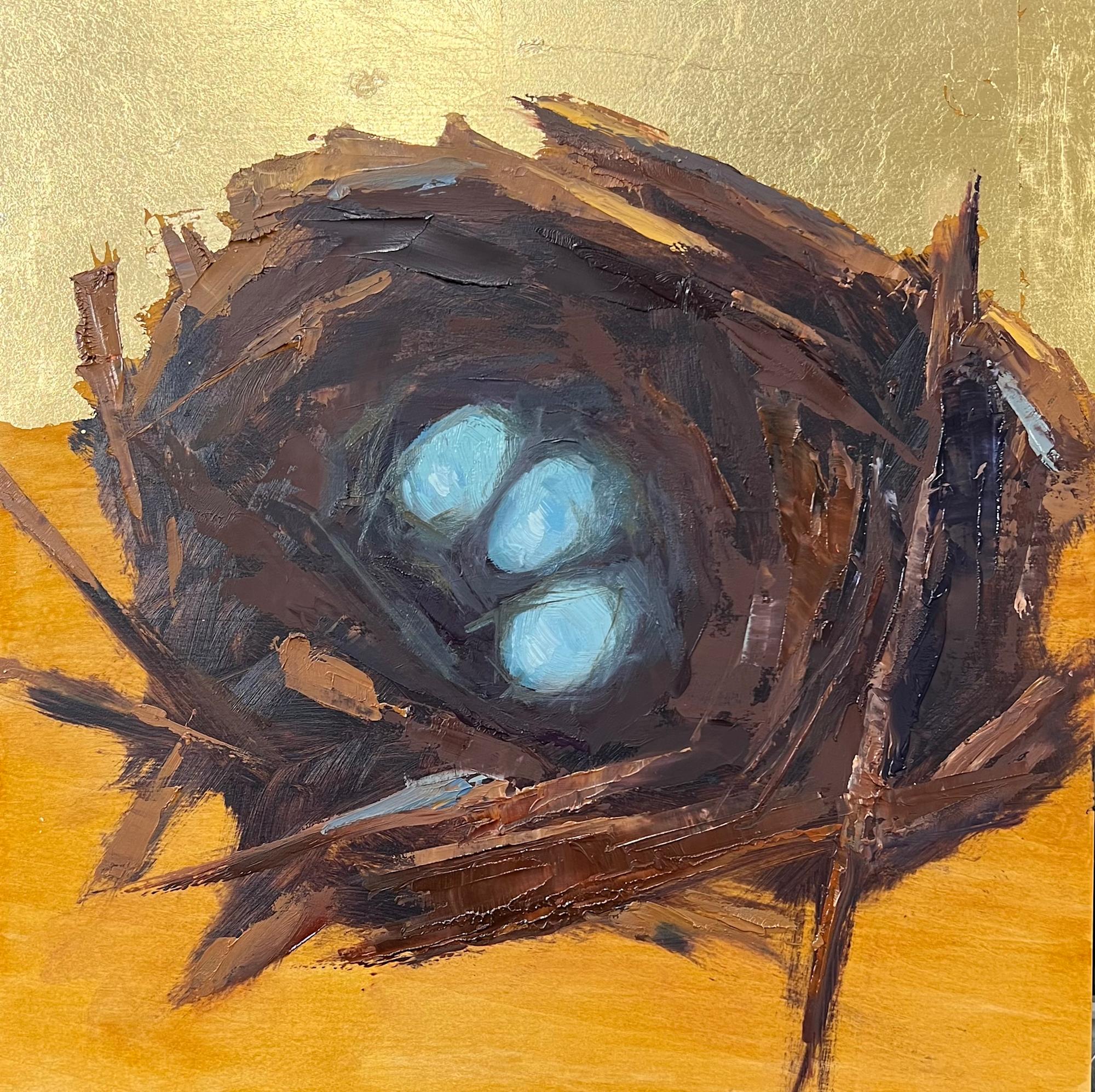 A symbol of hope, new beginnings, and the delicate beauty of nature, this striking oil painting captures the warmth of a carefully woven nest cradling vibrant blue eggs. The rich, textured brushstrokes bring depth and movement, while the luminous gold leaf background adds an ethereal glow, evoking a sense of wonder and reverence. Whether as a gift or a statement piece, this artwork brings a feeling of serenity and possibility into any space. Framed in an elegant black wooden floater frame.