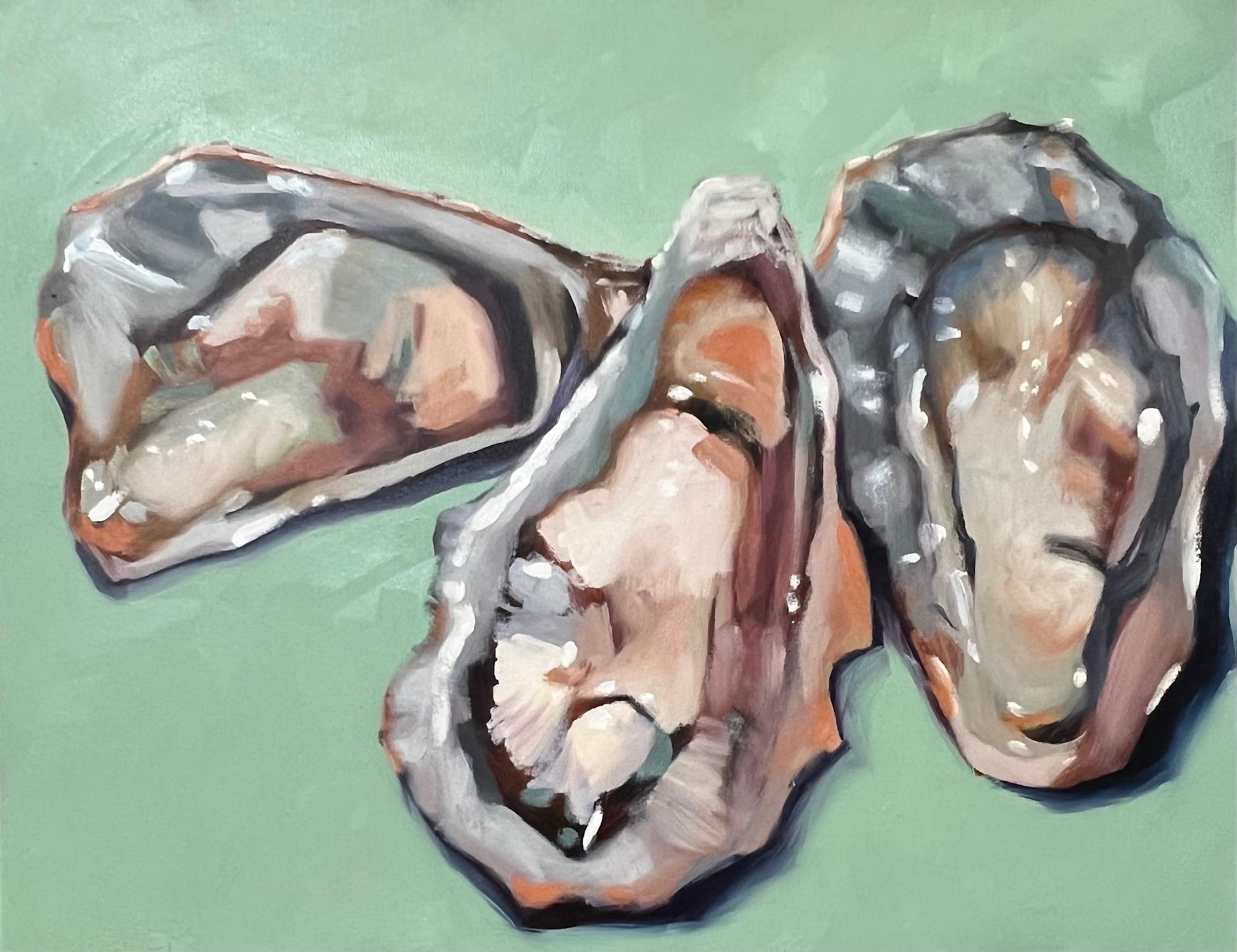 Three oysters are captured in boldly graphic and fresh color palette. Perfect for the beach or seafood lover.