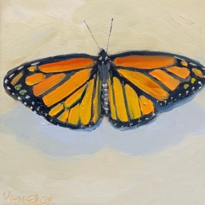 Orange and Black Butterfly 2 by Mary Kamerer Impressionist Painting  Image: Bring a touch of nature onto a shelf or small wall with a butterfly.  Lots of texture from palette knife application.