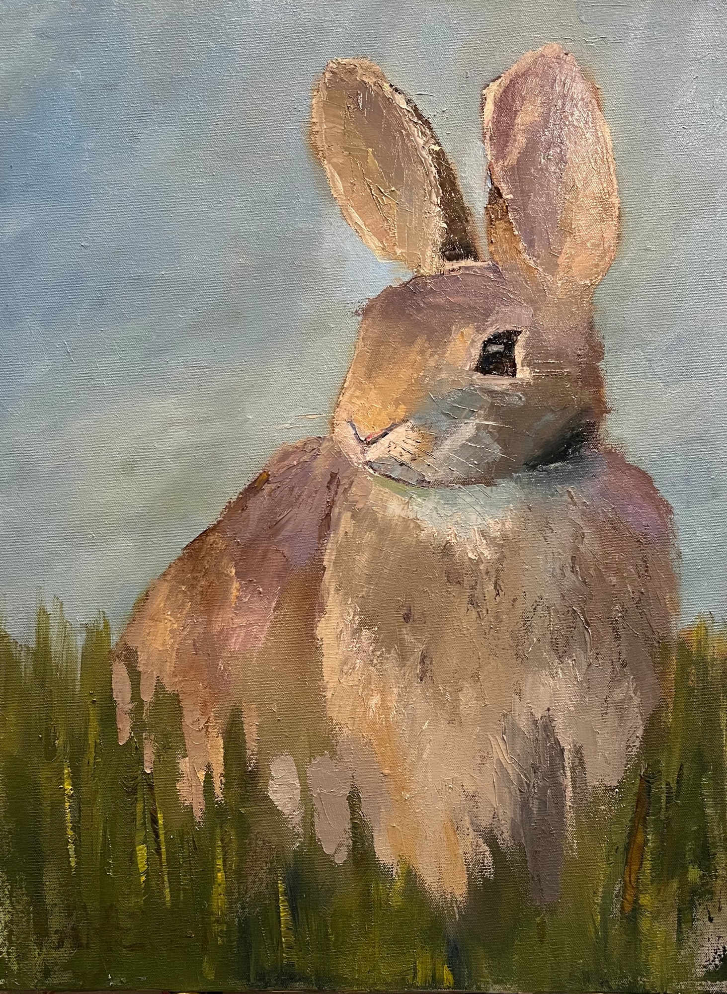 Sweet Spring colors are in this adorable fellow—soft blues, pinks, violets and greens. Lots of texture on this painting with liberal use of the palette knife
