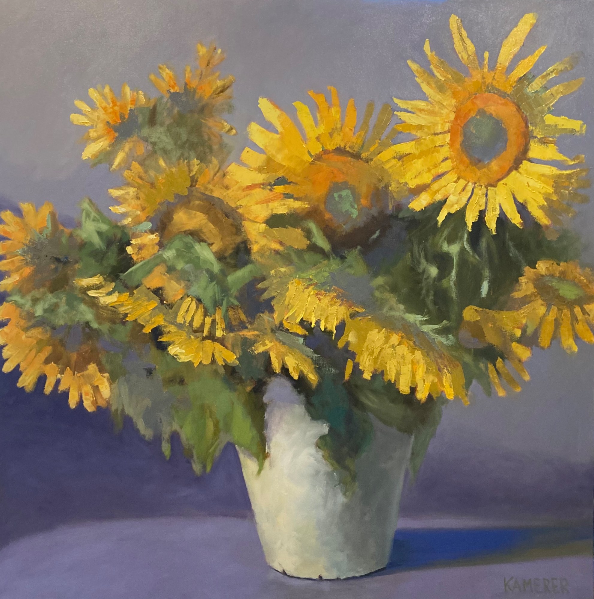 An abundance of sunflowers fills a white vase. Their sunny faces captured in oil in this very large statement piece. This painting brings cheer to any room and never needs water!