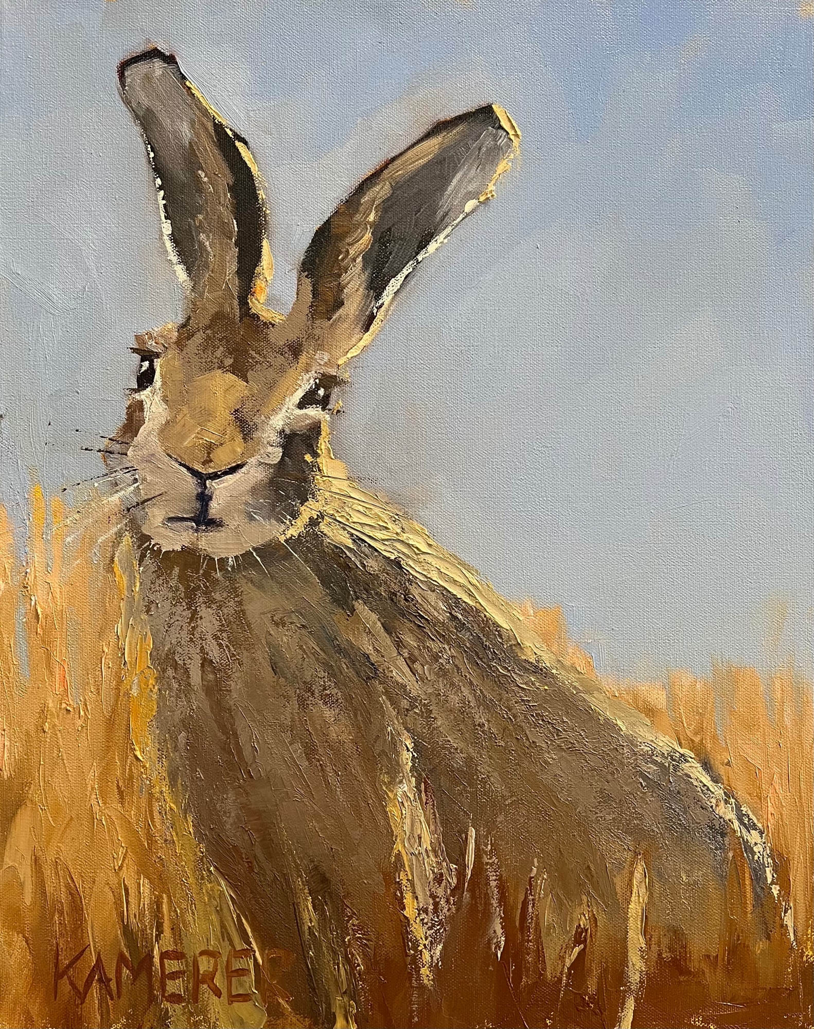 It all about the texture in this serious rabbit. Lots of palette-knife work makes this hare wonderfully textured and rich in warm colors of Fall.