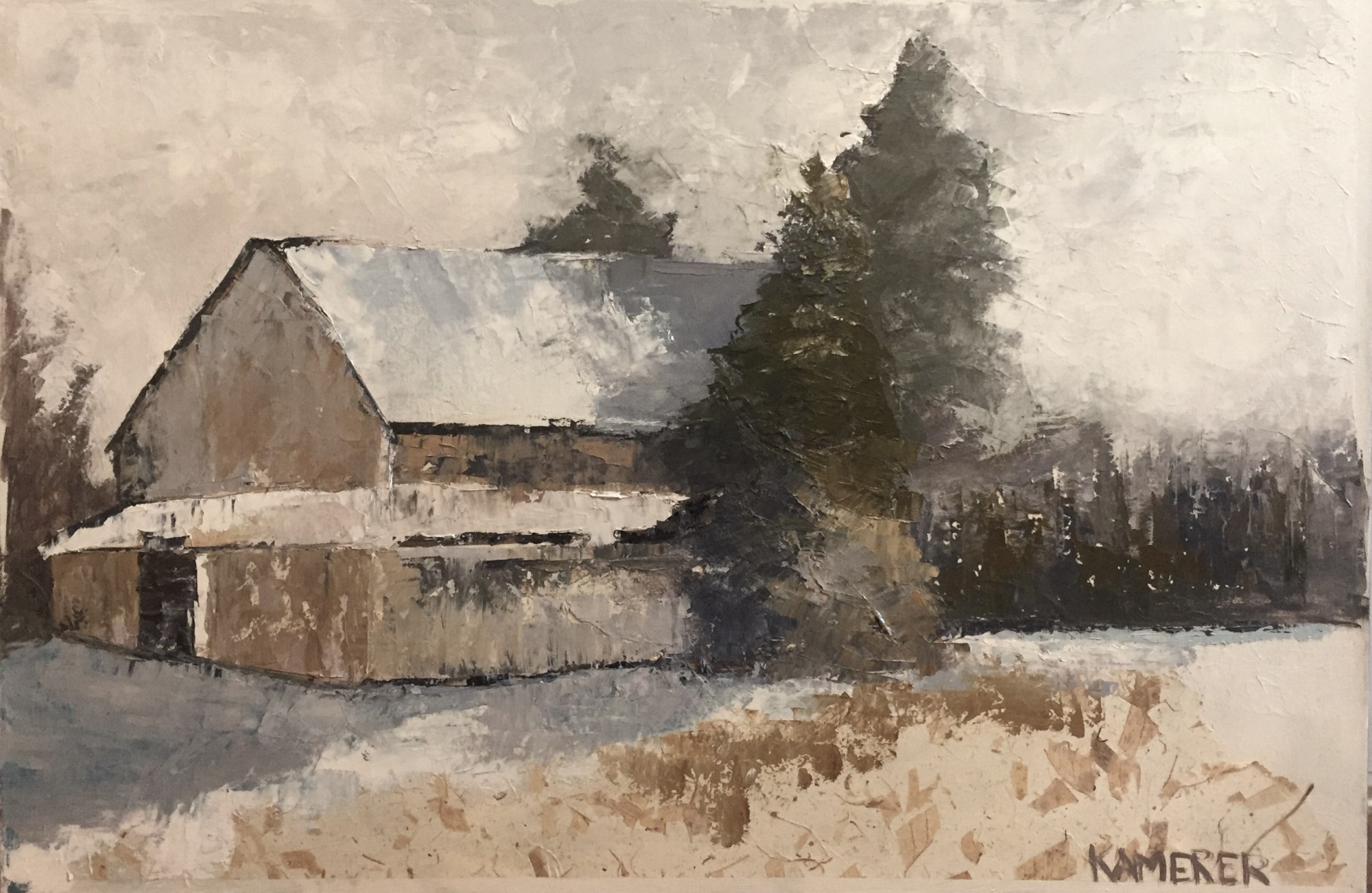 Hand-made papers, textured mediums and oil paint make up this lovely old barn in soft tonal colors with lots of texture,