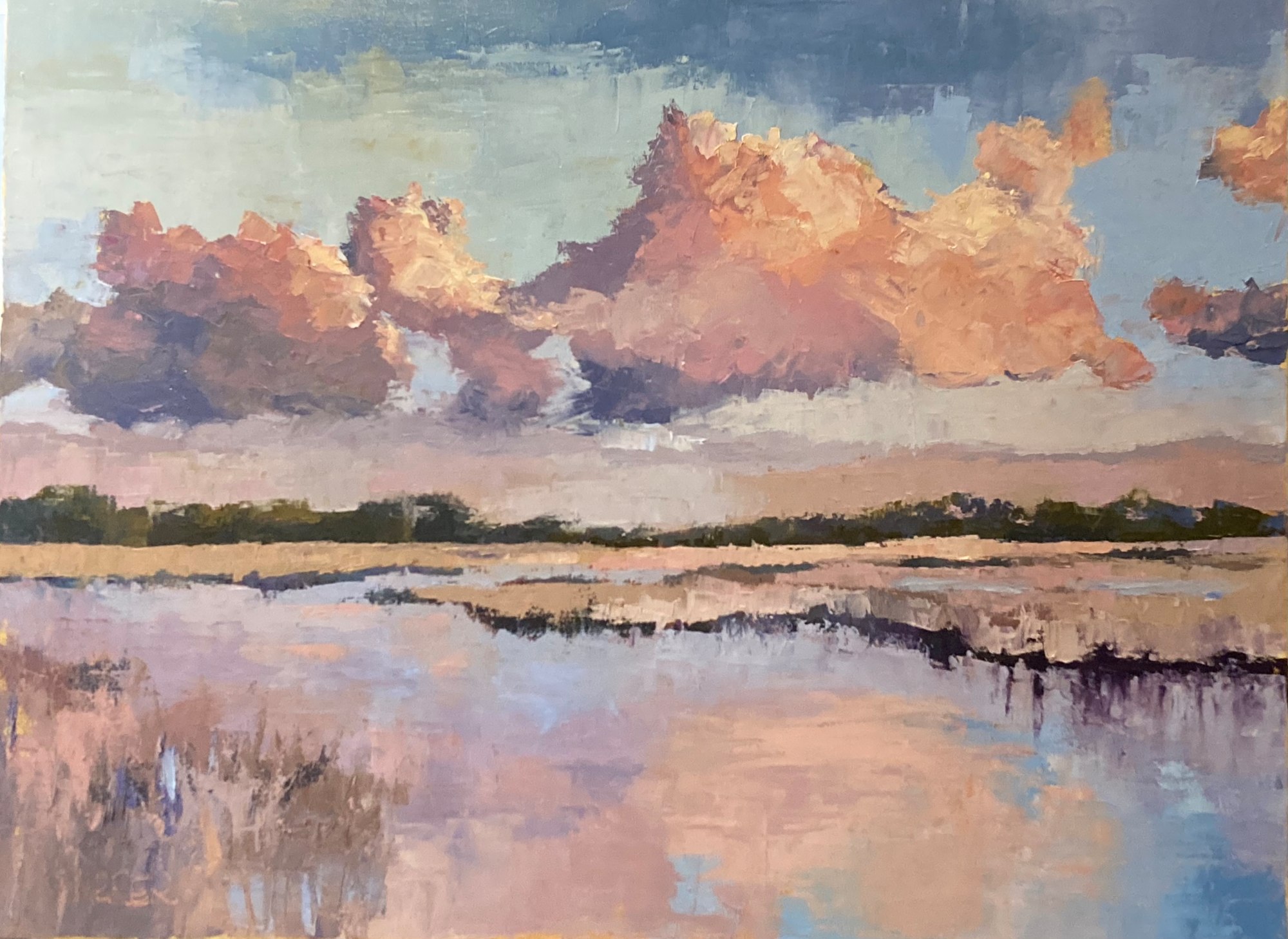 This coastal charmer captures that golden moment when evening clouds hang heavy with rich color and the sky is alight with warm illumination. I’ve tried to capture it in palette knife work, sculpting the clouds to bring as much texture and drama to this sky as I can.