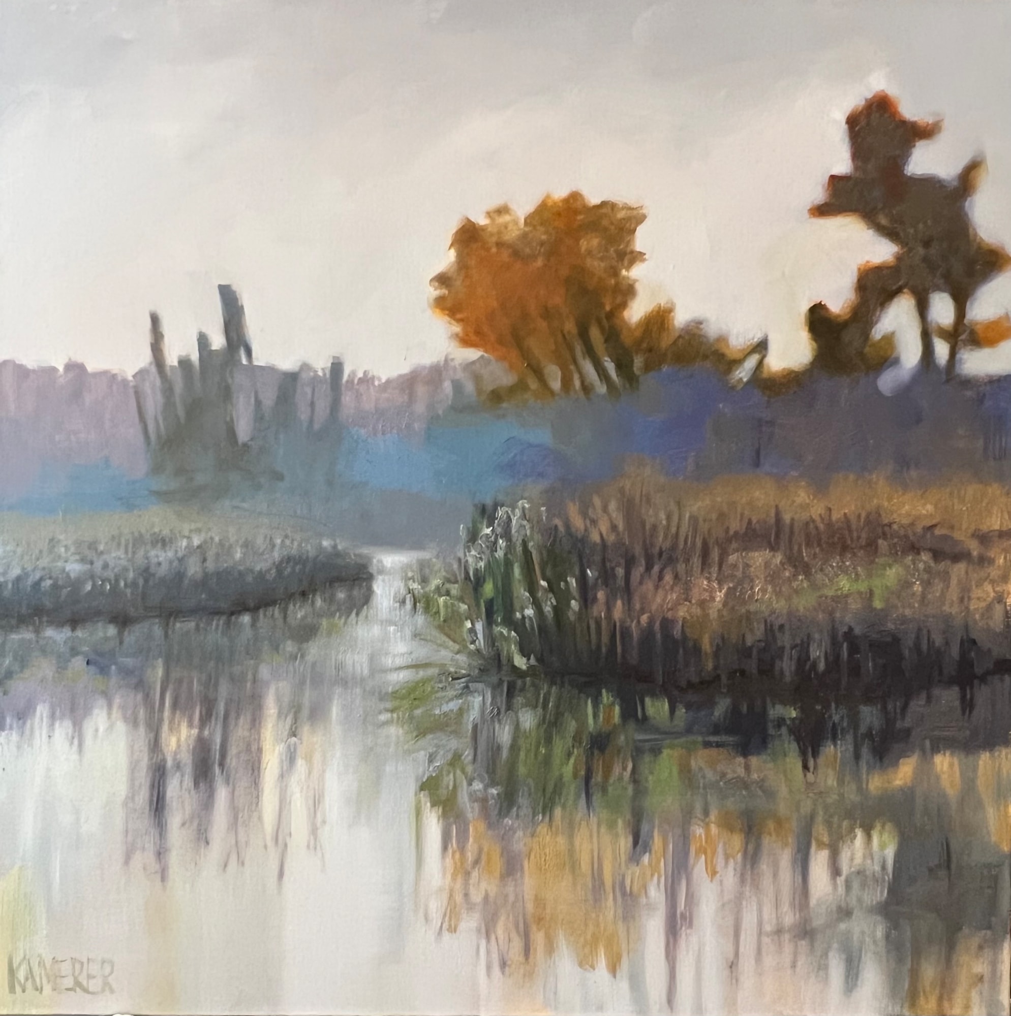 Soft values of blue, yellows, greens and violets in a modern marsh landscape. Framed in a natural wood floating frame.