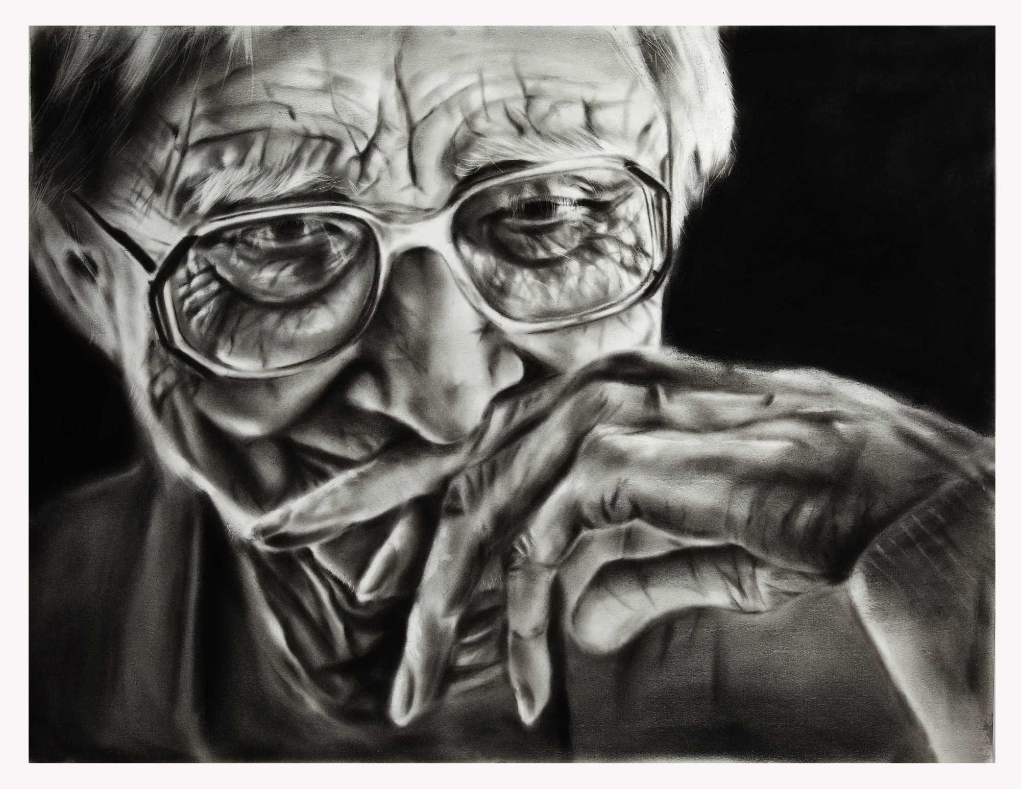 This charcoal drawing captures an elderly man sitting in quiet reflection. His posture and distant gaze suggest he is deep in thought, perhaps remembering moments from his past. The detailed lines and shadows emphasize the texture of his skin and the weight of time, bringing a sense of realism and emotion to the piece. The monochrome palette enhances the mood, focusing attention on expression and form.