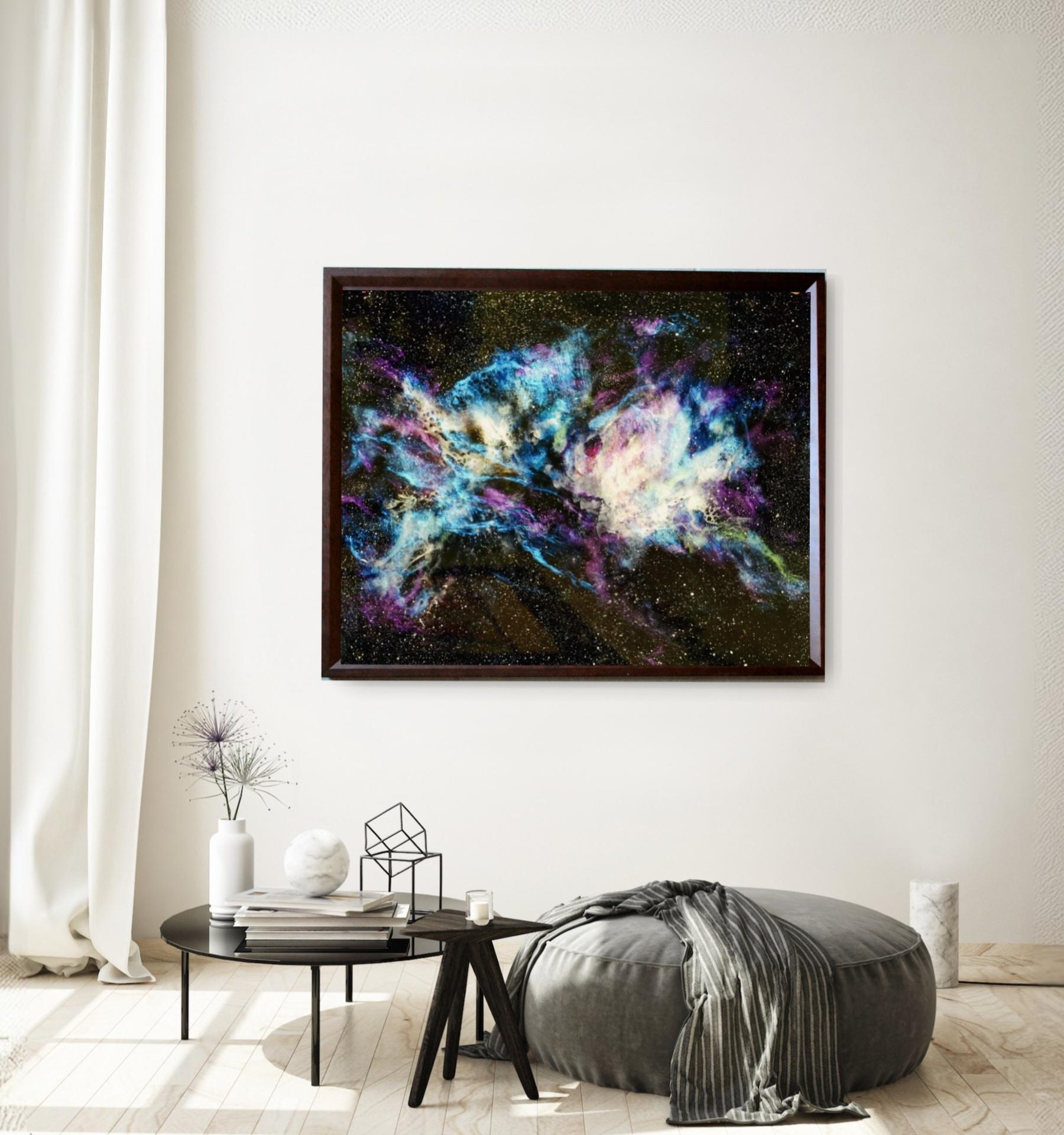 In this galaxy painting encased in 3 layers of glass-like resin, a cosmic dance of vibrant colors and celestial wonders unfolds. Deep, rich blues and purples swirl together to form the boundless expanse of space, reminiscent of distant galaxies and constellations. The resin's glossy finish not only preserves this cosmic feeling, but also adds depth and dimension.