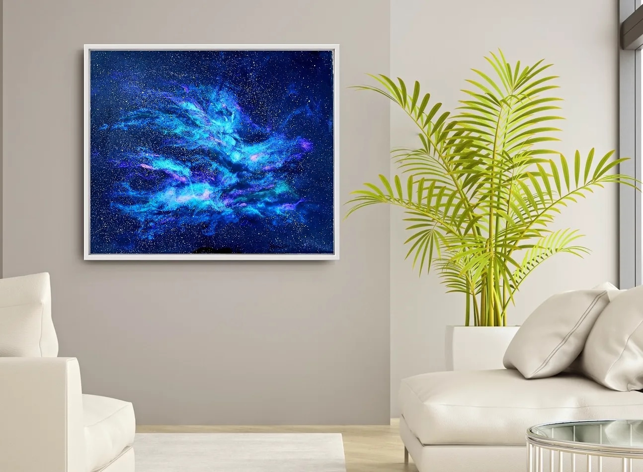 In this galaxy painting encased in 3 layers of glass-like resin, a cosmic dance of vibrant colors and celestial wonders unfolds. Deep, rich blues and purples swirl together to form the boundless expanse of space, reminiscent of distant galaxies and constellations. The resin's glossy finish not only preserves this cosmic feeling, but also adds depth and dimension.