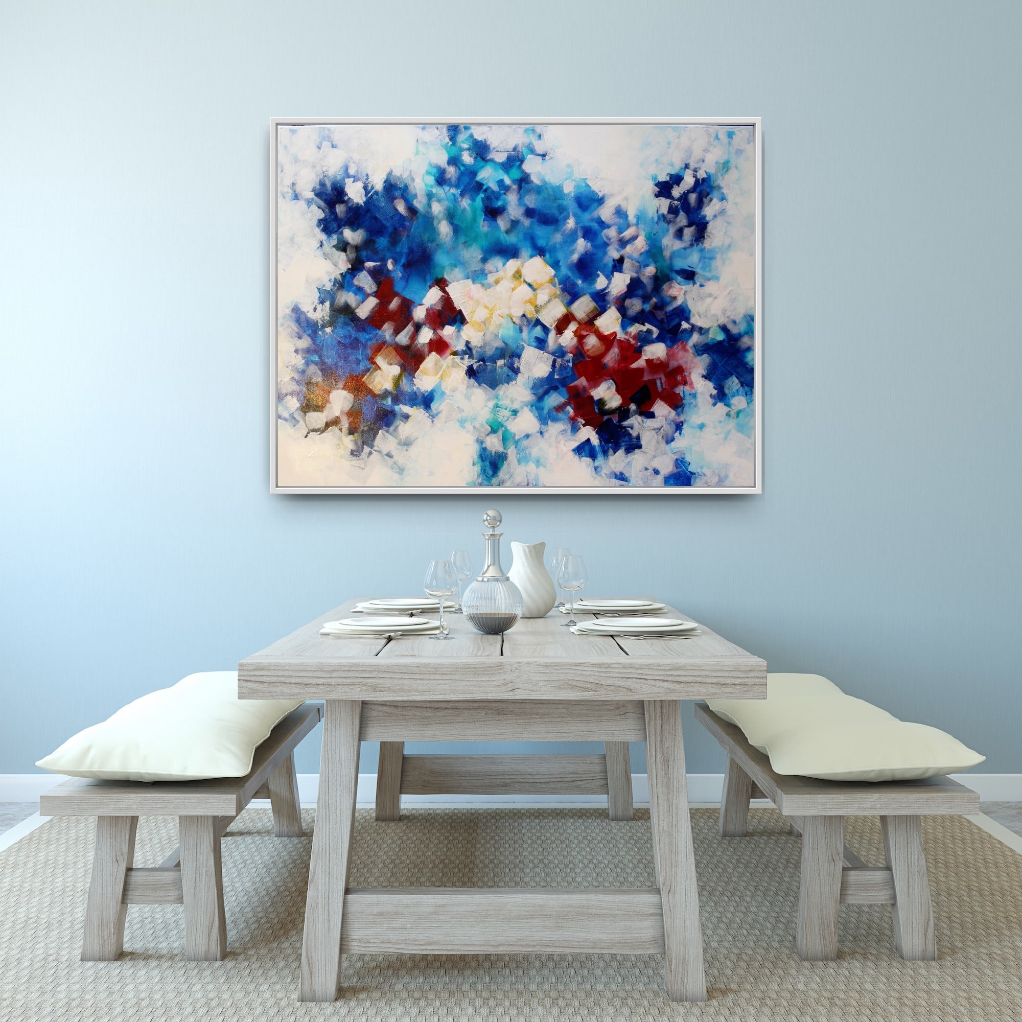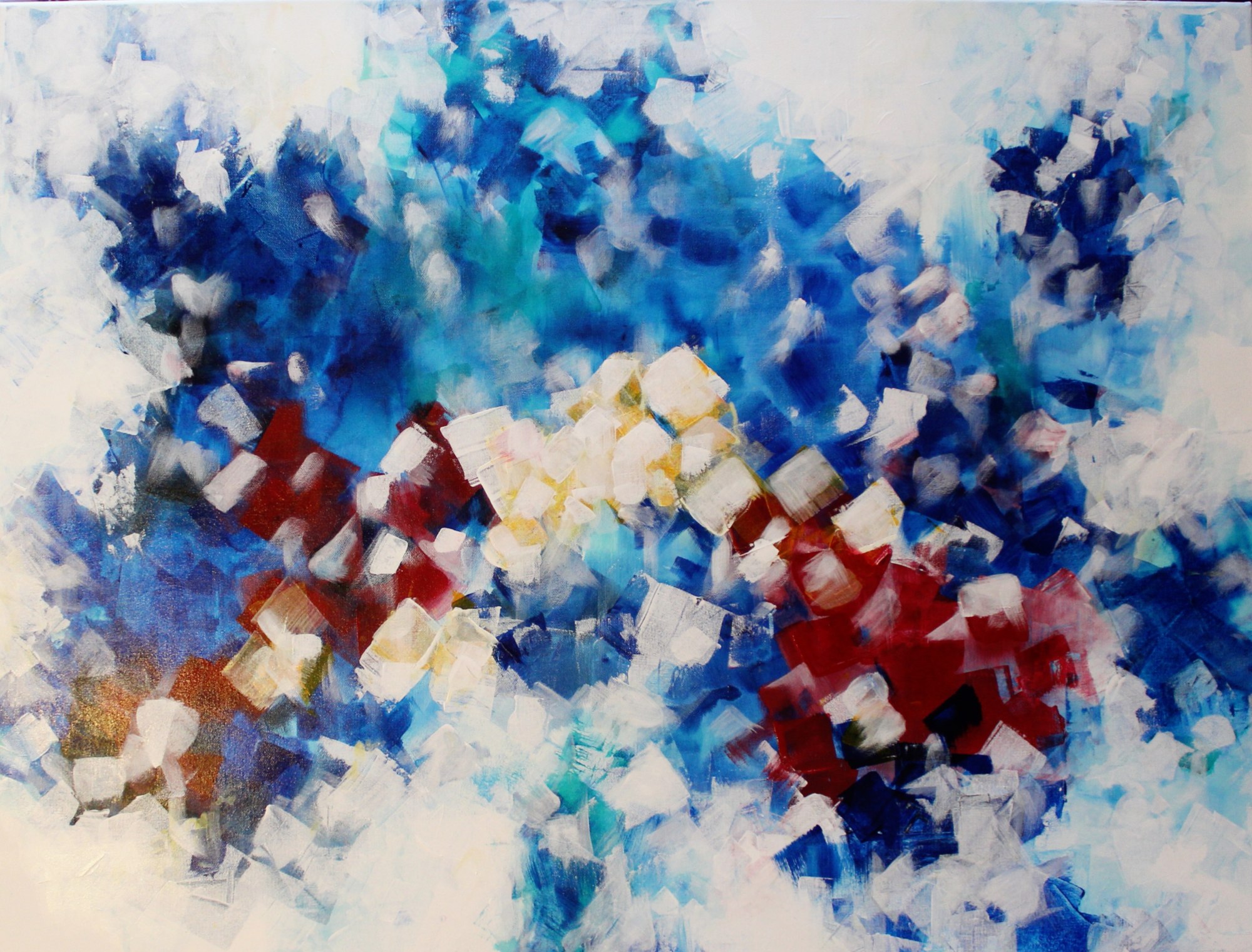 An expressive abstract on canvas, Whispers of the Mind uses bold red brushstrokes to evoke intense, difficult moments—those vivid memories that linger and shape us. These reds pulse with emotional weight. In contrast, sweeping blue strokes weave through the composition, representing calmer, cherished memories—moments of peace and clarity. Subtle white layers overlay and soften these elements, suggesting the passage of time and its gentle ability to smooth, blend, and carry healing. Together, these visual elements craft a layered emotional narrative: the interplay of struggle and serenity, memory and release, all held within the sweep of time.