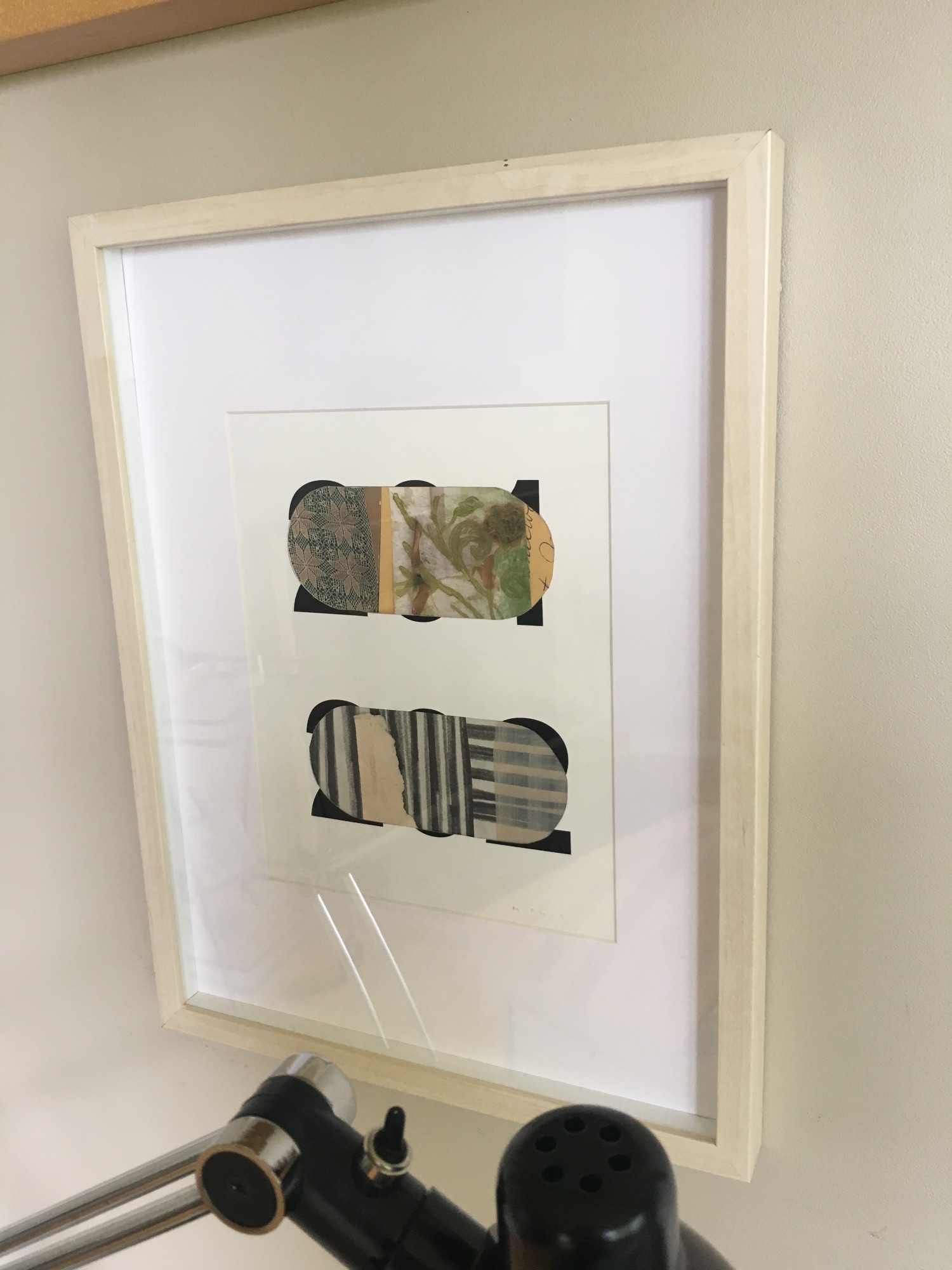 Cut-out capsule shapes on reclaimed 8.5 x 11 paper with found and reclaimed elements added. Framed and matted.