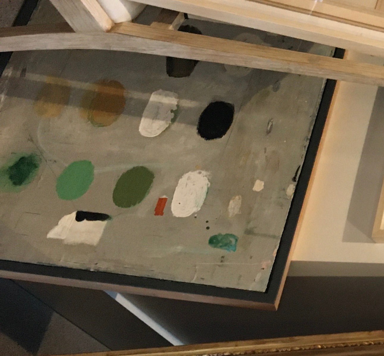 Framed, square painting with collage elements. Available through Maison Inc. [email protected]